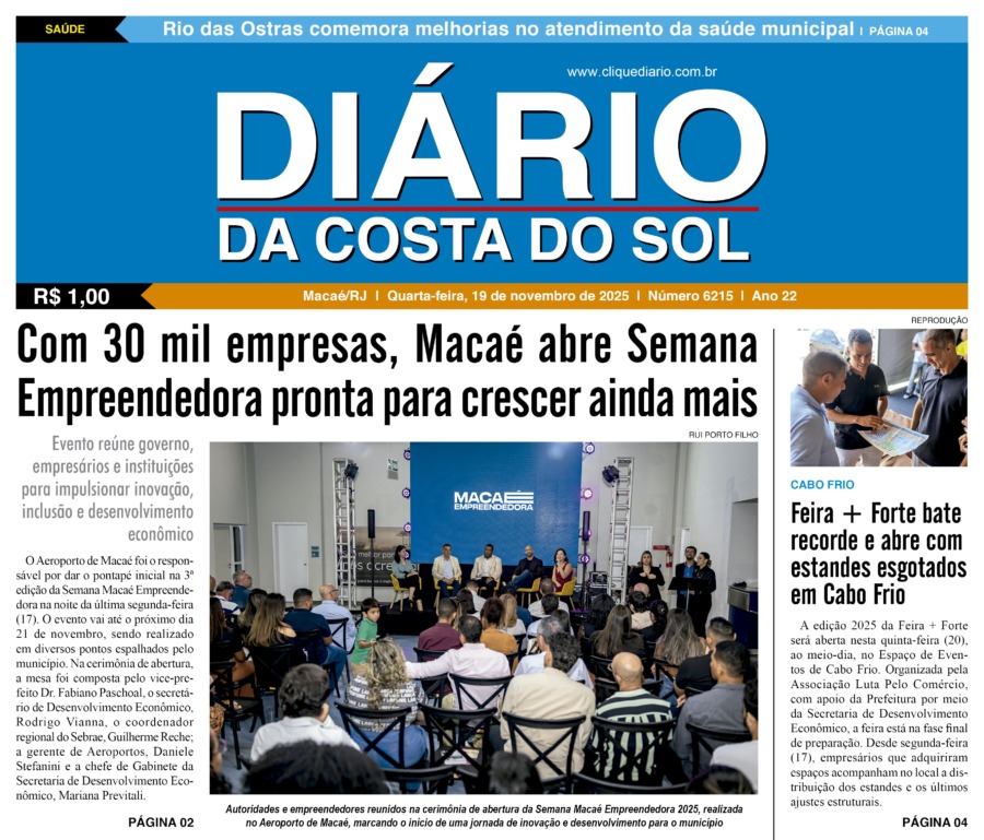 Edições Impressas Edição de quarta-feira 19/11/2025 nº 6215 Publicado em 19/11/2025 - 08:31 Escrito por Redação Notícias relacionadas: Anterior Edição de terça-feira 18/11/2025 nº 6214 Redação Notícias Recentes Edições Impressas16 segundos atrás Edição de quarta-feira 19/11/2025 nº 6215 Arraial do cabo16 horas atrás Educação de Arraial do Cabo orienta responsáveis sobre rematrícula para o próximo ano Cabo Frio16 horas atrás Evento comercial mais aguardado de Cabo Frio atinge 100% de estandes vendidos Saúde16 horas atrás Rio das Ostras comemora melhorias no atendimento da saúde municipal Cabo Frio16 horas atrás Nova exposição no Palácio das Águias recebe homenagem da cultura negra em Cabo Frio com 44 obras Arraial do cabo16 horas atrás A FIPAC em Arraial do Cabo alerta operadores náuticos: regularizem suas embarcações Comércio17 horas atrás Sindicomércio anuncia abertura do Natal Sesc 2025 em Rio das Ostras e Casimiro de Abreu Polícia17 horas atrás Polícia apreende drogas no Lagomar após varredura motivada por denúncia Polícia17 horas atrás Operação do GAT do 32º BPM apreende drogas, dinheiro e moto sem placa na Favela da Linha Desenvolvimento18 horas atrás Silva Jardim realiza audiência pública de revisão do seu Plano de Saneamento Básico Clique Diário E. L. Mídia Editora Ltda CNPJ: 09.298.880/0001-07 Redação: Rua Tupinambás 122 Gloria – Macaé/RJ comercial@diariocs.com (22) 2765-7353 (22) 999253130 Mais lidas da semana Cultura5 dias atrás Adilson Lopes apresenta exposição “Trajetória” em Casimiro de Abreu Polícia7 dias atrás Farmácia é interditada e uma pessoa é presa em Rio das Ostras em operação da Polícia Federal Meio Ambiente2 dias atrás Lagoa de Iriry, em Rio das Ostras, recebe nova sinalização focada em sustentabilidade Cidades2 dias atrás Macaé registra avanço na coleta seletiva porta a porta e recolhe mais de 2 toneladas em 45 dias