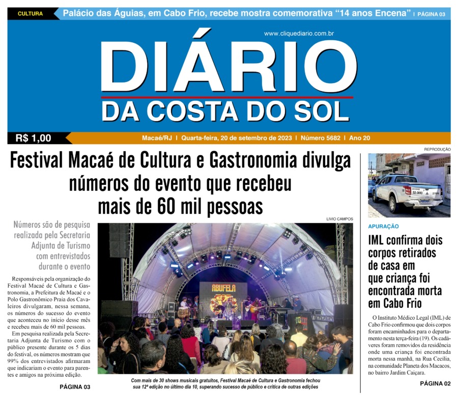 Edições Impressas Edição de quarta-feira 20/09/2023 nº 5682 Publicado em 19/09/2023 - 23:55 Escrito por Redação Notícias relacionadas: Seguinte Edição de quinta-feira 21/09/2023 nº 5683 Anterior Edição de terça-feira 19/09/2023 nº 5681 Redação Notícias Recentes Cabo Frio2 dias atrás Estudantes de Cabo Frio brilham em premiação do projeto CaptaAção Meio Ambiente2 dias atrás Cepro promove encontro para discutir avanços e desafios da justiça climática em Rio das Ostras Armação dos Búzios2 dias atrás Búzios Swim celebra esporte, natureza e turismo na Região dos Lagos Cabo Frio2 dias atrás Educação pública de Cabo Frio colhe frutos com conquistas em competições científicas Edições Impressas2 dias atrás Edição de sábado a segunda-feira 08 a 10/11/2025 nº 6208 Polícia2 dias atrás Moto sem placa é abandonada após fuga de suspeito em Macaé Polícia2 dias atrás Polícia Civil prende homem em flagrante por tráfico de drogas no Parque Aeroporto, em Macaé Iguaba2 dias atrás Menina de Iguaba Grande realiza sonho e conhece o príncipe William no Rio de Janeiro Arraial do cabo2 dias atrás Arraial do Cabo é exemplo de tranquilidade na Região dos Lagos, segundo dados do ISP Arraial do cabo2 dias atrás Festival em Arraial do Cabo promete recorde de público com mais de 15 mil pratos e 10 mil litros de chope Clique Diário E. L. Mídia Editora Ltda CNPJ: 09.298.880/0001-07 Redação: Rua Tupinambás 122 Gloria – Macaé/RJ comercial@diariocs.com (22) 2765-7353 (22) 999253130 Mais lidas da semana Arraial do cabo4 dias atrás Arraial do Cabo celebra 3ª edição do Festival de Frutos do Mar com entrada livre; Carol Biazin, Ramona Rox, Liah Soares e mais Meio Ambiente5 dias atrás Programa do governo estadual promove limpeza de rio no Âncora, em Rio das Ostras Meio Ambiente4 dias atrás Ações do Programa Limpa Rio seguem em vários pontos de Rio das Ostras Cidades6 dias atrás HFM ganha novo Pronto-Socorro moderno e ampliado em Campos