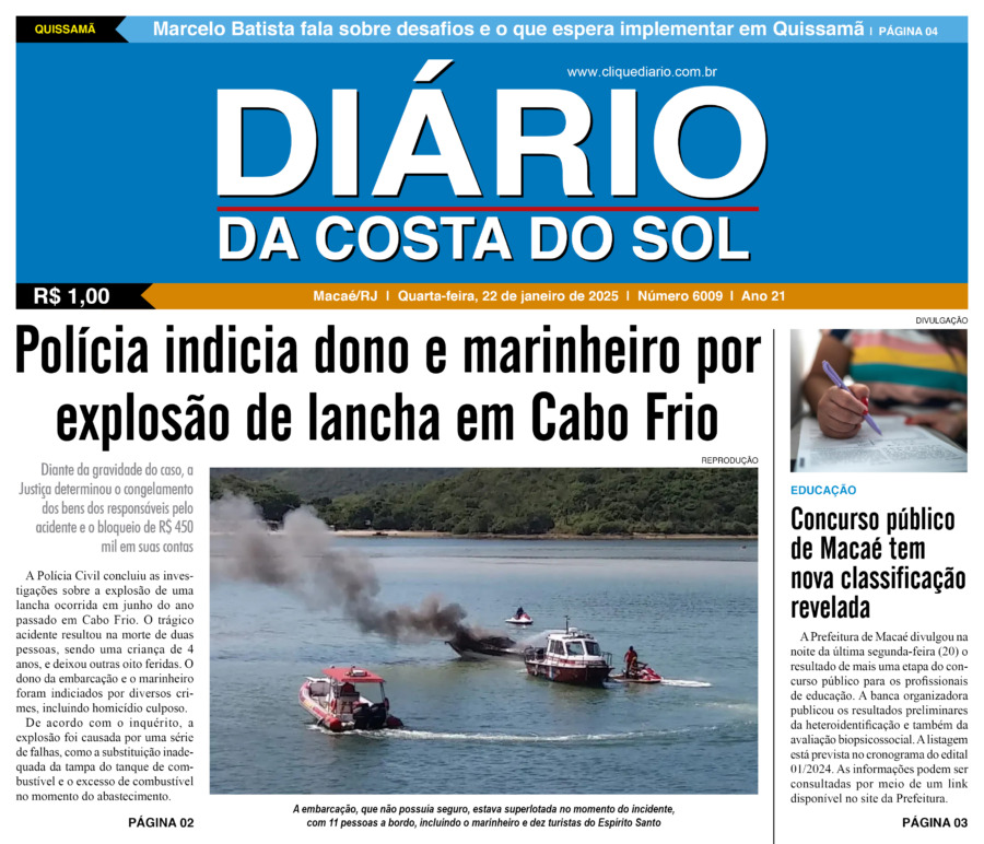 Edições Impressas Edição de quarta-feira 22/01/2025 nº 6009 Publicado em 22/01/2025 - 08:21 Escrito por Redação Notícias relacionadas: Seguinte Edição de quinta-feira 23/01/2025 nº 6010 Anterior Edição de terça-feira 21/01/2025 nº 6008 Redação Notícias Recentes Cabo Frio4 horas atrás Agentes de Cabo Frio recebem novo treinamento técnico para atuar em casos de poluição sonora Cabo Frio5 horas atrás Homem procurado por latrocínio é detido por agentes em Cabo Frio Cabo Frio5 horas atrás Representante da Guarda Civil de Cabo Frio compete na etapa final ao lado de jovens atletas Polícia5 horas atrás Prefeito de Rio das Ostras volta de Brasília com esperança de novos investimentos Cidades5 horas atrás Campos publica 8ª convocação e chama 374 professores substitutos para a rede municipal Esporte5 horas atrás De Saquarema para o Brasileirão: Vasco troca gramado de São Januário Cidades5 horas atrás Quissamã inicia planejamento educacional para 2026 com foco em Educação Financeira Polícia8 horas atrás Mulher é presa na RJ-106, em Saquarema, com R$ 38 mil em drogas e arma Saúde9 horas atrás Silva Jardim tem aulão em alusão à campanha mundial do Novembro Azul Mobilidade10 horas atrás Mobilidade promove fiscalização para verificar situação de táxis em Rio das Ostras Clique Diário E. L. Mídia Editora Ltda CNPJ: 09.298.880/0001-07 Redação: Rua Tupinambás 122 Gloria – Macaé/RJ comercial@diariocs.com (22) 2765-7353 (22) 999253130 Mais lidas da semana Cultura10 horas atrás Adilson Lopes apresenta exposição “Trajetória” em Casimiro de Abreu Cidades3 dias atrás Servidores de Rio das Ostras participam de treinamento do Estado em Búzios Polícia2 dias atrás Farmácia é interditada e uma pessoa é presa em Rio das Ostras em operação da Polícia Federal Cidades2 dias atrás Vereadores de Macaé vão embarcar nesta quinta para participar da COP 30 em Belém