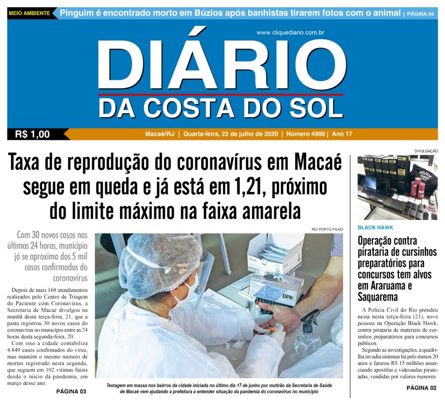 Edições Impressas Edição de quarta-feira 22/07/2020 nº 4906 Publicado em 22/07/2020 - 05:00 Escrito por Fernando Vitor Notícias relacionadas:destaque Seguinte Edição de quinta-feira 23/07/2020 nº 4907 Anterior Edição de terça-feira 21_07_2020 nº 4905 Fernando Vitor Notícias Recentes Cabo Frio15 horas atrás Arte e solidariedade marcam a 1ª Mostra de Dança Regional de Tamoios Cidades21 horas atrás Região serrana de Macaé recebe 1º X-Force Passeio de Quadriciclo e Aranha neste domingo (26) Polícia21 horas atrás Polícia apreende mais de meio quilo de drogas no Loteamento São João, em Rio das Ostras Saúde2 dias atrás Eventos esportivo e cultural reforça campanha do Outubro Rosa em Rio das Ostras nesse domingo, 26 Edições Impressas2 dias atrás Sábado a segunda-feira 25 a 27/10/2025 nº 6197 Cidades2 dias atrás Shopping Plaza Macaé oferece programação gratuita com feira de adoção e show de pagode neste fim de semana Cidades3 dias atrás 32º BPM completa 23 anos com solenidade de celebração e reconhecimento aos policiais Armação dos Búzios3 dias atrás Búzios celebra esporte e superação com XC RUN 2025 Araruama3 dias atrás Araruama promove saúde, lazer e cidadania em evento comunitário Arraial do cabo3 dias atrás Educação e sustentabilidade se encontram para jovens de Arraial do Cabo Clique Diário E. L. Mídia Editora Ltda CNPJ: 09.298.880/0001-07 Redação: Rua Tupinambás 122 Gloria – Macaé/RJ comercial@diariocs.com (22) 2765-7353 (22) 999253130 Mais lidas da semana Cultura7 dias atrás Silva Jardim anuncia shows gratuitos de samba e pagode para o fim de semana Cultura6 dias atrás Música, emoção e cores: Rodrigo Pontes apresenta show especial em Rio das Ostras Cabo Frio6 dias atrás Atletas de várias cidades se enfrentam em competição de Muay Thai em Cabo Frio Cabo Frio6 dias atrás Serviços essenciais permanecem ativos durante ponto facultativo em Cabo Frio