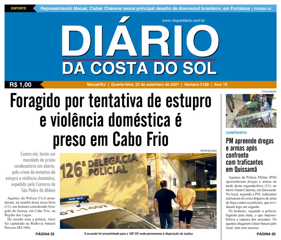 Edições Impressas Edição de quarta-feira 22/09/2021 n° 5189 Publicado em 22/09/2021 - 02:04 Escrito por Fernando Vitor Notícias relacionadas: Seguinte Edição de quinta-feira 23/09/2021 n° 5190 Anterior Edição de terça-feira 21/09/2021 n° 5188 Fernando Vitor Notícias Recentes Armação dos Búzios13 horas atrás Búzios atinge 80% de ocupação no feriado Cabo Frio14 horas atrás Cabo Frio prepara esquema especial de segurança nas praias e áreas de lazer Cabo Frio14 horas atrás Cabo Frio realiza ações de proteção a fauna após aparecimento de animais em bairros Cabo Frio14 horas atrás Cabo Frio reúne especialistas em evento do programa “Vim Cuidar de Você” Desenvolvimento14 horas atrás Rio das Ostras estreita relações com a Rede Petro BC de olho em eventos do setor de energia em 2026 Cabo Frio14 horas atrás Aula-passeio apresenta riqueza cultural e ambiental de Cabo Frio na Fazenda Campos Novos Cabo Frio14 horas atrás Cabo Frio suspende expediente em órgãos públicos nesta sexta Cidades14 horas atrás Macaé terá Dia do Futebol Feminino e programa para valorização da mulher rural Arraial do cabo14 horas atrás Carreta científica desembarca em Arraial do Cabo com programação gratuita Polícia15 horas atrás Polícia Civil prende liderança do ADA no bairro Fronteira em Macaé Clique Diário E. L. Mídia Editora Ltda CNPJ: 09.298.880/0001-07 Redação: Rua Tupinambás 122 Gloria – Macaé/RJ comercial@diariocs.com (22) 2765-7353 (22) 999253130 Mais lidas da semana Cultura6 dias atrás Adilson Lopes apresenta exposição “Trajetória” em Casimiro de Abreu Desenvolvimento14 horas atrás Rio das Ostras estreita relações com a Rede Petro BC de olho em eventos do setor de energia em 2026 Cidades3 dias atrás Macaé registra avanço na coleta seletiva porta a porta e recolhe mais de 2 toneladas em 45 dias Mobilidade6 dias atrás Mobilidade promove fiscalização para verificar situação de táxis em Rio das Ostras