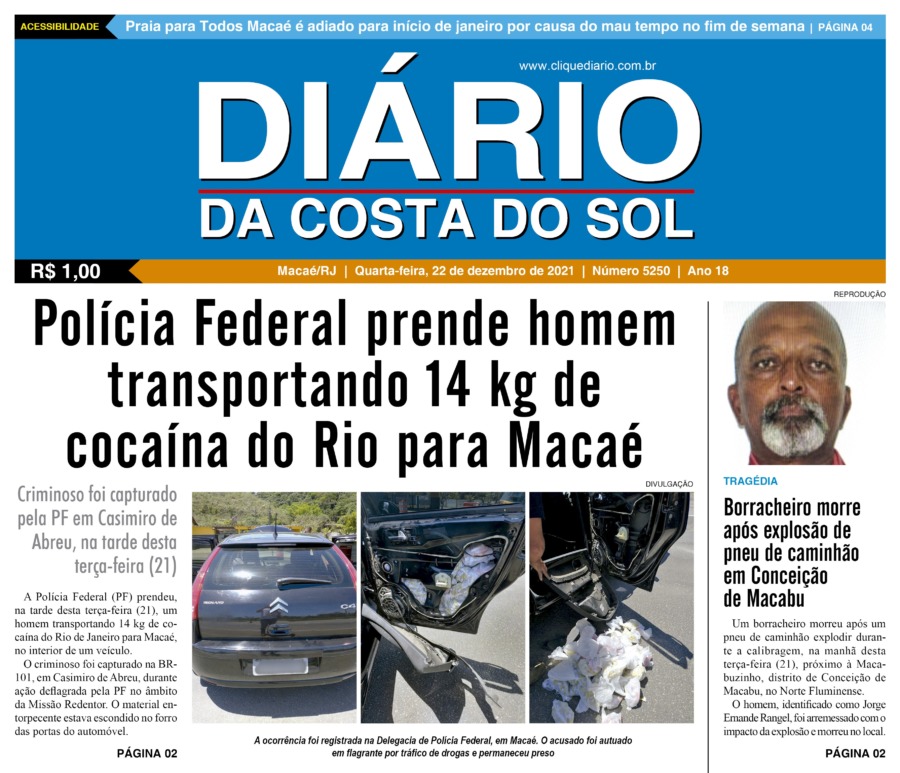 Edições Impressas Edição de quarta-feira 22/12/2021 nº 5250 Publicado em 22/12/2021 - 00:01 Escrito por Fernando Vitor Notícias relacionadas: Seguinte Edição de quinta-feira 23/12/2021 nº 5251 Anterior Edição de terça-feira 21/12/2021 nº 5249 Fernando Vitor Notícias Recentes Armação dos Búzios11 horas atrás Búzios atinge 80% de ocupação no feriado Cabo Frio12 horas atrás Cabo Frio prepara esquema especial de segurança nas praias e áreas de lazer Cabo Frio12 horas atrás Cabo Frio realiza ações de proteção a fauna após aparecimento de animais em bairros Cabo Frio12 horas atrás Cabo Frio reúne especialistas em evento do programa “Vim Cuidar de Você” Desenvolvimento12 horas atrás Rio das Ostras estreita relações com a Rede Petro BC de olho em eventos do setor de energia em 2026 Cabo Frio12 horas atrás Aula-passeio apresenta riqueza cultural e ambiental de Cabo Frio na Fazenda Campos Novos Cabo Frio12 horas atrás Cabo Frio suspende expediente em órgãos públicos nesta sexta Cidades12 horas atrás Macaé terá Dia do Futebol Feminino e programa para valorização da mulher rural Arraial do cabo12 horas atrás Carreta científica desembarca em Arraial do Cabo com programação gratuita Polícia12 horas atrás Polícia Civil prende liderança do ADA no bairro Fronteira em Macaé Clique Diário E. L. Mídia Editora Ltda CNPJ: 09.298.880/0001-07 Redação: Rua Tupinambás 122 Gloria – Macaé/RJ comercial@diariocs.com (22) 2765-7353 (22) 999253130 Mais lidas da semana Cultura6 dias atrás Adilson Lopes apresenta exposição “Trajetória” em Casimiro de Abreu Desenvolvimento12 horas atrás Rio das Ostras estreita relações com a Rede Petro BC de olho em eventos do setor de energia em 2026 Cidades2 dias atrás Macaé registra avanço na coleta seletiva porta a porta e recolhe mais de 2 toneladas em 45 dias Mobilidade6 dias atrás Mobilidade promove fiscalização para verificar situação de táxis em Rio das Ostras