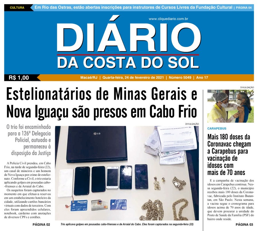 Edições Impressas Edição de quarta-feira 24/02/2021 nº 5049 Publicado em 24/02/2021 - 07:38 Escrito por Fernando Vitor Notícias relacionadas:destaque Seguinte Edição de quinta-feira 25/02/2021 nº 5050 Anterior Edição de terça-feira 23/02/2021 nº 5048 Fernando Vitor Notícias Recentes Cabo Frio13 minutos atrás Procon Cabo Frio atua com órgãos estaduais em vistoria rigorosa Cabo Frio1 hora atrás Iniciativa de Cabo Frio fortalece conexão entre candidatos e empregadores locais Polícia2 horas atrás Homem acusado de participar de assassinato de pai e filha é preso em Maricá Cidades3 horas atrás Hospital Ferreira Machado vai ganhar novo setor de imunização especializado em Campos Cidades3 horas atrás Mobilidade Urbana vai iniciar cadastramento de veículos para o espetáculo das Águas Dançantes em Macaé Cidades3 horas atrás Iluminação de Macaé ganha eficiência e sustentabilidade com novo projeto em parceria com a Enel Polícia4 horas atrás Farmácia é interditada e uma pessoa é presa em Rio das Ostras em operação da Polícia Federal Polícia4 horas atrás Homem é preso nessa madrugada na Cidade Praiana, em Rio das Ostras Edições Impressas4 horas atrás Edição de quarta-feira 12/11/2025 nº 6210 Arraial do cabo20 horas atrás Arraial do Cabo promove imersão cultural no Mês da Consciência Negra com o Festival Ubuntu Clique Diário E. L. Mídia Editora Ltda CNPJ: 09.298.880/0001-07 Redação: Rua Tupinambás 122 Gloria – Macaé/RJ comercial@diariocs.com (22) 2765-7353 (22) 999253130 Mais lidas da semana Arraial do cabo6 dias atrás Arraial do Cabo celebra 3ª edição do Festival de Frutos do Mar com entrada livre; Carol Biazin, Ramona Rox, Liah Soares e mais Meio Ambiente6 dias atrás Ações do Programa Limpa Rio seguem em vários pontos de Rio das Ostras Meio Ambiente7 dias atrás Programa do governo estadual promove limpeza de rio no Âncora, em Rio das Ostras Cidades6 dias atrás Quissamã participa do lançamento do Programa Ambiente Resiliente, do Governo do Estado