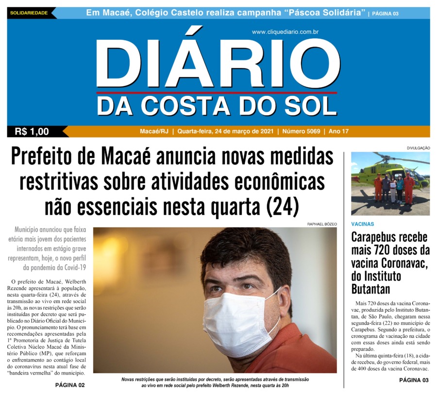 Edições Impressas Edição de quarta-feira 24/03/2021 nº 5069 Publicado em 24/03/2021 - 08:41 Escrito por Fernando Vitor Notícias relacionadas:destaque Seguinte Edição de quinta-feira 25/03/2021 nº 5070 Anterior Edição de terça-feira 23/03/2021 nº 5068 Fernando Vitor Notícias Recentes Segurança Pública58 minutos atrás Prefeito de Rio das Ostras se manifesta após mais uma ação da PM contra barricadas do tráfico Polícia2 horas atrás Homem é detido por envolvimento com o tráfico durante patrulhamento na Nova Holanda, em Macaé Polícia2 horas atrás Polícia apreende grande quantidade de drogas durante operação no Nova Esperança em Macaé Polícia2 horas atrás Polícia recupera carro roubado antes mesmo do registro da ocorrência em Rio das Ostras Edições Impressas2 horas atrás Edição de quinta-feira 13/11/2025 nº 6211 Cidades2 horas atrás Macaé é finalista no Festival Internacional de Cinema Cristão com “A Paixão de Cristo” Cabo Frio18 horas atrás Reforma marca nova fase para o esporte cabo-friense e aniversário da cidade Arraial do cabo19 horas atrás Fórum de Arraial propõe novo modelo de desenvolvimento baseado nos 3Ds; Desvincular, Descarbonizar e Descontaminar Saúde19 horas atrás Saúde de Rio das Ostras promove mutirão de cirurgia pediátrica nessa semana Cidades19 horas atrás Guarda Ambiental resgata jiboia de três metros em área urbana de Macaé Clique Diário E. L. Mídia Editora Ltda CNPJ: 09.298.880/0001-07 Redação: Rua Tupinambás 122 Gloria – Macaé/RJ comercial@diariocs.com (22) 2765-7353 (22) 999253130 Mais lidas da semana Arraial do cabo7 dias atrás Arraial do Cabo celebra 3ª edição do Festival de Frutos do Mar com entrada livre; Carol Biazin, Ramona Rox, Liah Soares e mais Meio Ambiente7 dias atrás Ações do Programa Limpa Rio seguem em vários pontos de Rio das Ostras Cidades7 dias atrás Quissamã participa do lançamento do Programa Ambiente Resiliente, do Governo do Estado Cabo Frio7 dias atrás Música, poesia e memória celebram os 410 anos de Cabo Frio