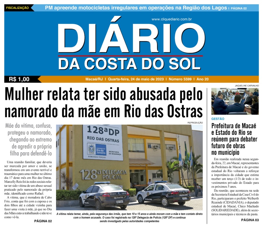Edições Impressas Edição de quarta-feira 24/05/2023 nº 5599 Publicado em 23/05/2023 - 23:55 Escrito por Redação Notícias relacionadas: Seguinte Edição de quinta-feira 25/05/2023 nº 5600 Anterior Edição de terça-feira 23/05/2023 nº 5598 Redação Notícias Recentes Cultura11 horas atrás Rio das Ostras tem 2 cineclubes selecionados para 2ª Mostra Mercosul Audiovisual Cidades11 horas atrás Câmara de Macaé debate aumento de acidentes e propõe Semana de Prevenção a Acidentes com Motociclistas Arraial do cabo11 horas atrás Instituto de Previdência de Arraial do Cabo aplica provas objetivas neste domingo (2) Cidades11 horas atrás Quissamã é destaque nacional ao integrar rede de inovação em Atenção Primária à Saúde da Fiocruz Cabo Frio11 horas atrás Cabo Frio inicia obra de reestruturação na Praça São Benedito para melhorar mobilidade e segurança Cabo Frio11 horas atrás Obra na Rua dos Biquínis marca nova fase de valorização dos espaços públicos em Cabo Frio Polícia11 horas atrás Mulher é morta a tiros enquanto carregava bebê no colo em Campos Armação dos Búzios12 horas atrás Búzios sedia Encontro Fluminense FBHA com foco no fortalecimento do turismo regional Cultura12 horas atrás Festival de Frutos do Mar de Rio das Ostras é lançado em evento para convidados Mobilidade13 horas atrás Acidente assusta moradores e deixa RJ-106 interditada em Saquarema Clique Diário E. L. Mídia Editora Ltda CNPJ: 09.298.880/0001-07 Redação: Rua Tupinambás 122 Gloria – Macaé/RJ comercial@diariocs.com (22) 2765-7353 (22) 999253130 Mais lidas da semana Edições Impressas4 dias atrás Edição de sábado a segunda-feira 25 a 27/10/2025 nº 6198 Edições Impressas7 dias atrás Edição de quarta-feira 22/10/2025 nº 6195 Cabo Frio13 horas atrás Audiência pública discute receitas e despesas previstas para Cabo Frio no próximo ano Edições Impressas6 dias atrás Edição de quinta-feira 23/10/2025 nº 6196