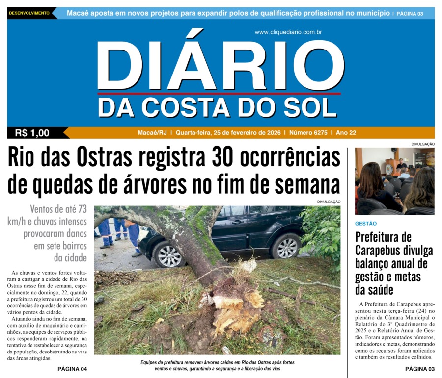 Edições Impressas Edição de quarta-feira 25/02/2026 nº 6275 Publicado em 25/02/2026 - 08:30 Escrito por Redação Notícias relacionadas: Anterior Edição de terça-feira 24/02/2026 nº 6274 Redação Notícias Recentes Polícia3 minutos atrás Denúncia anônima leva polícia a ponto de drogas no bairro Visconde de Araújo Edições Impressas1 hora atrás Edição de quarta-feira 25/02/2026 nº 6275 Cidades17 horas atrás Macaé aposta em novos projetos para expandir qualificação profissional no município Cultura18 horas atrás Matrículas da Onda terminam nessa quarta-feira, 25, em Rio das Ostras Cidades18 horas atrás Carapebus apresenta Relatório do 3º Quadrimestre de 2025 na Câmara Cidades18 horas atrás Quissamã celebra sucesso do Carnaval 2026 e resgate de tradições Cidades19 horas atrás Rio das Ostras registra 30 ocorrências de quedas de árvores no fim de semana Polícia19 horas atrás Polícia prende 9 pessoas por tráfico após denúncias em localidade de Maricá Cidades21 horas atrás Saquarema realiza ações unindo saúde, inclusão social e sustentabilidade Cabo Frio22 horas atrás Cultura de Cabo Frio promove reunião participativa com representantes do meio cristão Clique Diário E. L. Mídia Editora Ltda CNPJ: 09.298.880/0001-07 Redação: Rua Tupinambás 122 Gloria – Macaé/RJ comercial@diariocs.com (22) 2765-7353 (22) 999253130 Mais lidas da semana Saúde2 dias atrás Caminhada marca Dia Nacional de Combate às Drogas e ao Alcoolismo em Silva Jardim Cidades5 dias atrás Rio das Ostras flagra mais 5 ligações clandestinas de esgoto em ação pós-Carnaval Cidades5 dias atrás Polícia de Campos investiga cadáver localizado na areia da Praia do Farol de São Tomé Cidades3 dias atrás Durval Lelys agita Macaé com trio elétrico na orla da Praia Campista neste domingo (22)
