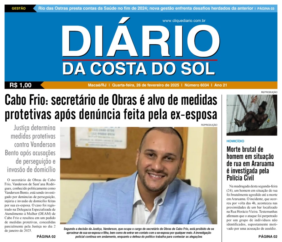 Edições Impressas Edição de quarta-feira 26/02/2025 nº 6034 Publicado em 26/02/2025 - 08:35 Escrito por Redação Notícias relacionadas: Seguinte Edição de quinta-feira 27/02/2025 nº 6035 Anterior Edição de terça-feira 25/02/2025 nº 6033 Redação Notícias Recentes Cabo Frio56 minutos atrás Secretaria de Educação de Cabo Frio participa de jornada do MEC voltada à inclusão linguística Arraial do cabo1 hora atrás Castração sem custo é retomada em Arraial do Cabo para controle populacional de gatos Cabo Frio1 hora atrás Operação da Guarda Civil de Cabo Frio fiscaliza motos no Peró após queixas de moradores Cabo Frio1 hora atrás Cabo Frio realiza mais uma edição da Feira de Adoção Animal no Centro Cabo Frio1 hora atrás “Pertencimento” guia ações culturais do Mês da Consciência Negra 2025 em Cabo Frio Saúde1 hora atrás Rio das Ostras terá prorrogação da Campanha Nacional de Multivacinação até novembro Cidades2 horas atrás Ônibus Rosa oferece atendimentos de saúde na Praça Washington Luís nesta quarta e quinta em Macaé Cidades2 horas atrás Contas da Prefeitura de Macaé dos anos de 2022 e 2023 são aprovadas por unanimidade na Câmara Cultura2 horas atrás Orange Sound faz tributo ao Kid Abelha nessa quinta, 30, no Teatro de Rio das Ostras Cidades3 horas atrás Silva Jardim tem evento do Outubro Rosa nessa quinta, 30, no Teatro Clique Diário E. L. Mídia Editora Ltda CNPJ: 09.298.880/0001-07 Redação: Rua Tupinambás 122 Gloria – Macaé/RJ comercial@diariocs.com (22) 2765-7353 (22) 999253130 Mais lidas da semana Edições Impressas4 dias atrás Edição de sábado a segunda-feira 25 a 27/10/2025 nº 6198 Cultura7 horas atrás Prédio da Onda, em Rio das Ostras, recebe oficina teatral gratuita a partir dessa quinta, 30 Edições Impressas6 dias atrás Edição de quinta-feira 23/10/2025 nº 6196 Edições Impressas5 dias atrás Edição de sexta-feira 24/10/2025 nº 6197