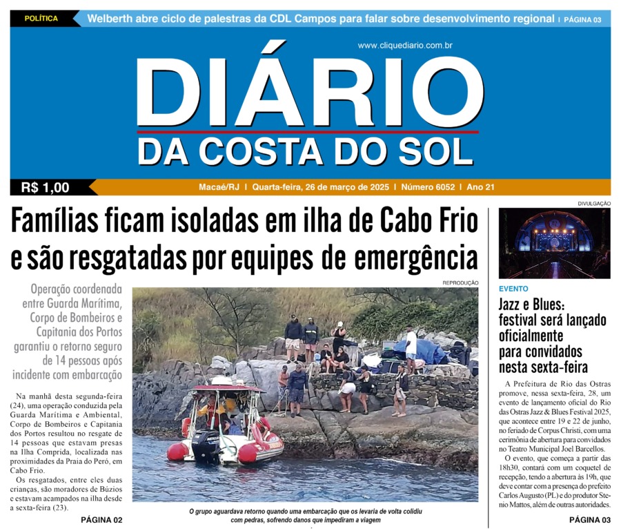 Edições Impressas Edição de quarta-feira 26/03/2025 nº 6052 Publicado em 26/03/2025 - 08:30 Escrito por Redação Notícias relacionadas: Seguinte Edição de quinta-feira 27/03/2025 nº 6053 Anterior Edição de terça-feira 25/03/2025 nº 6051 Redação Notícias Recentes Edições Impressas1 hora atrás Edição de sábado a segunda-feira 08 a 10/11/2025 nº 6208 Polícia1 hora atrás Moto sem placa é abandonada após fuga de suspeito em Macaé Polícia3 horas atrás Polícia Civil prende homem em flagrante por tráfico de drogas no Parque Aeroporto, em Macaé Iguaba18 horas atrás Menina de Iguaba Grande realiza sonho e conhece o príncipe William no Rio de Janeiro Arraial do cabo18 horas atrás Arraial do Cabo é exemplo de tranquilidade na Região dos Lagos, segundo dados do ISP Arraial do cabo18 horas atrás Festival em Arraial do Cabo promete recorde de público com mais de 15 mil pratos e 10 mil litros de chope Arraial do cabo18 horas atrás Oficina une saúde, cidadania e acolhimento em Arraial do Cabo Arraial do cabo18 horas atrás Sucesso de público marca o primeiro dia da Arraial Expo XP Cabo Frio18 horas atrás Prefeitura de Cabo Frio premia autoras com experiências culturais e incentivo à leitura Cidades19 horas atrás Macaé realiza audiência pública do Projeto Macaé +20 no dia 10 de dezembro Clique Diário E. L. Mídia Editora Ltda CNPJ: 09.298.880/0001-07 Redação: Rua Tupinambás 122 Gloria – Macaé/RJ comercial@diariocs.com (22) 2765-7353 (22) 999253130 Mais lidas da semana Arraial do cabo2 dias atrás Arraial do Cabo celebra 3ª edição do Festival de Frutos do Mar com entrada livre; Carol Biazin, Ramona Rox, Liah Soares e mais Meio Ambiente3 dias atrás Programa do governo estadual promove limpeza de rio no Âncora, em Rio das Ostras Meio Ambiente2 dias atrás Ações do Programa Limpa Rio seguem em vários pontos de Rio das Ostras Educação4 dias atrás Estudantes de Rio das Ostras são destaques em evento nacional da Educação