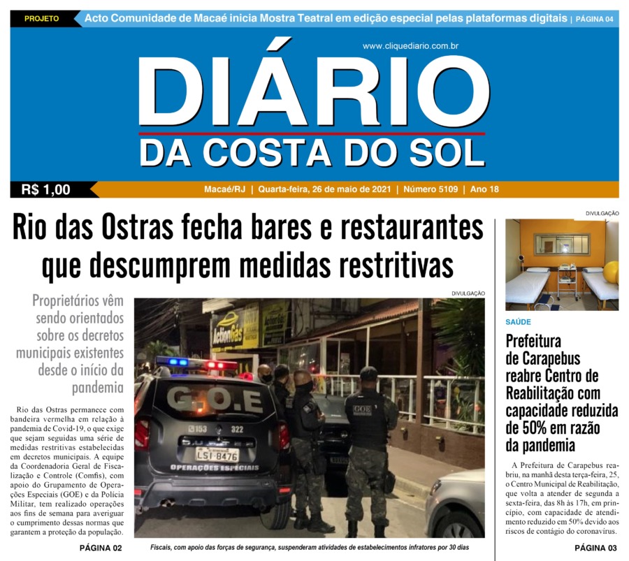 Edições Impressas Edição de quarta-feira 26/05/2021 n° 5109 Publicado em 26/05/2021 - 06:10 Escrito por Fernando Vitor Notícias relacionadas:destaque Seguinte Edição de quinta-feira 27/05/2021 nº 5110 Anterior Edição de terça-feira 25/05/2021 nº 5108 Fernando Vitor Notícias Recentes Cabo Frio1 hora atrás Agentes de Cabo Frio recebem novo treinamento técnico para atuar em casos de poluição sonora Cabo Frio2 horas atrás Homem procurado por latrocínio é detido por agentes em Cabo Frio Cabo Frio2 horas atrás Representante da Guarda Civil de Cabo Frio compete na etapa final ao lado de jovens atletas Polícia2 horas atrás Prefeito de Rio das Ostras volta de Brasília com esperança de novos investimentos Cidades2 horas atrás Campos publica 8ª convocação e chama 374 professores substitutos para a rede municipal Esporte3 horas atrás De Saquarema para o Brasileirão: Vasco troca gramado de São Januário Cidades3 horas atrás Quissamã inicia planejamento educacional para 2026 com foco em Educação Financeira Polícia6 horas atrás Mulher é presa na RJ-106, em Saquarema, com R$ 38 mil em drogas e arma Saúde6 horas atrás Silva Jardim tem aulão em alusão à campanha mundial do Novembro Azul Mobilidade7 horas atrás Mobilidade promove fiscalização para verificar situação de táxis em Rio das Ostras Clique Diário E. L. Mídia Editora Ltda CNPJ: 09.298.880/0001-07 Redação: Rua Tupinambás 122 Gloria – Macaé/RJ comercial@diariocs.com (22) 2765-7353 (22) 999253130 Mais lidas da semana Cultura7 horas atrás Adilson Lopes apresenta exposição “Trajetória” em Casimiro de Abreu Polícia2 dias atrás Farmácia é interditada e uma pessoa é presa em Rio das Ostras em operação da Polícia Federal Cidades3 dias atrás Servidores de Rio das Ostras participam de treinamento do Estado em Búzios Cidades2 dias atrás Vereadores de Macaé vão embarcar nesta quinta para participar da COP 30 em Belém