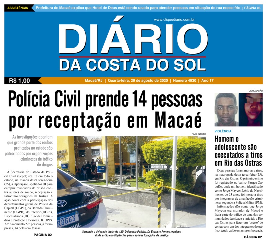 Edições Impressas Edição de quarta-feira 26/08/2020 nº 4930 Publicado em 26/08/2020 - 05:00 Escrito por Fernando Vitor Notícias relacionadas:destaque Seguinte Edição de quinta-feira 27/08/2020 nº 4931 Anterior Edição de terça-feira 25/08/2020 nº 4929 Fernando Vitor Notícias Recentes Cabo Frio10 horas atrás Arte e solidariedade marcam a 1ª Mostra de Dança Regional de Tamoios Cidades15 horas atrás Região serrana de Macaé recebe 1º X-Force Passeio de Quadriciclo e Aranha neste domingo (26) Polícia15 horas atrás Polícia apreende mais de meio quilo de drogas no Loteamento São João, em Rio das Ostras Saúde1 dia atrás Eventos esportivo e cultural reforça campanha do Outubro Rosa em Rio das Ostras nesse domingo, 26 Edições Impressas2 dias atrás Sábado a segunda-feira 25 a 27/10/2025 nº 6197 Cidades2 dias atrás Shopping Plaza Macaé oferece programação gratuita com feira de adoção e show de pagode neste fim de semana Cidades2 dias atrás 32º BPM completa 23 anos com solenidade de celebração e reconhecimento aos policiais Armação dos Búzios2 dias atrás Búzios celebra esporte e superação com XC RUN 2025 Araruama2 dias atrás Araruama promove saúde, lazer e cidadania em evento comunitário Arraial do cabo2 dias atrás Educação e sustentabilidade se encontram para jovens de Arraial do Cabo Clique Diário E. L. Mídia Editora Ltda CNPJ: 09.298.880/0001-07 Redação: Rua Tupinambás 122 Gloria – Macaé/RJ comercial@diariocs.com (22) 2765-7353 (22) 999253130 Mais lidas da semana Cultura6 dias atrás Silva Jardim anuncia shows gratuitos de samba e pagode para o fim de semana Cultura6 dias atrás Música, emoção e cores: Rodrigo Pontes apresenta show especial em Rio das Ostras Cabo Frio6 dias atrás Atletas de várias cidades se enfrentam em competição de Muay Thai em Cabo Frio Cabo Frio6 dias atrás Serviços essenciais permanecem ativos durante ponto facultativo em Cabo Frio
