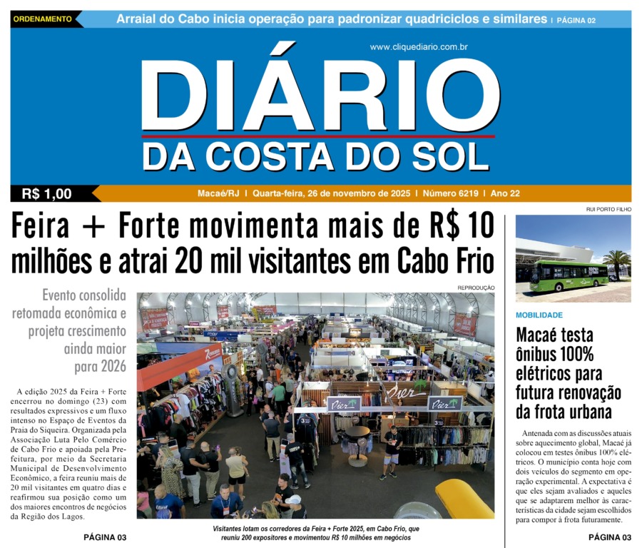 Edições Impressas Edição de quarta-feira 26/11/2025 nº 6219 Publicado em 26/11/2025 - 09:18 Escrito por Redação Notícias relacionadas: Anterior Edição de terça-feira 25/11/2025 nº 6218 Redação Notícias Recentes Infraestrutura29 minutos atrás Silva Jardim comemora início das obras da quadra esportiva de Mato Alto Meio Ambiente54 minutos atrás Denúncia da Guarda Ambiental impede abertura irregular da Lagoa de Iriry, em Rio das Ostras Polícia1 hora atrás Polícia Federal realiza operação em Campos contra armazenamento de material de abuso infantil Cidades1 hora atrás Macaé é a primeira cidade do RJ a oferecer Wellhub aos servidores municipais Política1 hora atrás Rio das Ostras entrega honraria para secretária estadual de Cultura e Economia Criativa Polícia1 hora atrás Polícia Civil prende suspeito ligado ao tráfico na comunidade da Fronteira, em Macaé Edições Impressas2 horas atrás Edição de quarta-feira 26/11/2025 nº 6219 Arraial do cabo19 horas atrás Arraial do Cabo estabelece novas diretrizes para operação e uso da Marina dos Pescadores Sem categoria19 horas atrás Arraial do Cabo inicia operação para padronizar quadriciclos e similares Saúde19 horas atrás Rio das Ostras amplia vacinação contra HPV até dezembro para jovens até 19 anos Clique Diário E. L. Mídia Editora Ltda CNPJ: 09.298.880/0001-07 Redação: Rua Tupinambás 122 Gloria – Macaé/RJ comercial@diariocs.com (22) 2765-7353 (22) 999253130 Mais lidas da semana Desenvolvimento7 dias atrás Rio das Ostras estreita relações com a Rede Petro BC de olho em eventos do setor de energia em 2026 Cabo Frio6 dias atrás Cabo Frio promove ação do projeto Capoeiragem para registro de documentário Cultura7 dias atrás Moda e Prosa Caipira tem sua 6ª edição nessa quinta, 20, em Saquarema Sem categoria6 dias atrás Cabo Frio recebe iniciativa que vai orientar Política Estadual do Empreendedorismo