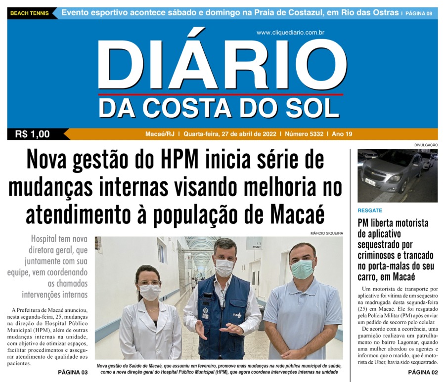 Edições Impressas Edição de quarta-feira 27/04/2022 nº 5332 Publicado em 26/04/2022 - 23:55 Escrito por Fernando Vitor Notícias relacionadas: Seguinte Edição de quinta-feira 28/04/2022 nº 5333 Anterior Edição de terça-feira 26/04/2022 nº 5331 Fernando Vitor Notícias Recentes Cultura32 minutos atrás Moda e Prosa Caipira tem sua 6ª edição nessa quinta, 20, em Saquarema Comércio2 horas atrás Rio das Ostras tem 19ª edição de sua tradicional feira outlet nesse feriado Cidades2 horas atrás Macaé recebe 20ª edição do Prefeitura Presente no dia 25 de novembro Polícia3 horas atrás Denúncia anônima leva à prisão de duas mulheres por tráfico em Macaé Cidades3 horas atrás Caravana de Natal Coca-Cola passa por Rio das Ostras e Casimiro de Abreu nessa quinta, 20 Edições Impressas5 horas atrás Edição de quarta-feira 19/11/2025 nº 6215 Arraial do cabo20 horas atrás Educação de Arraial do Cabo orienta responsáveis sobre rematrícula para o próximo ano Cabo Frio20 horas atrás Evento comercial mais aguardado de Cabo Frio atinge 100% de estandes vendidos Saúde21 horas atrás Rio das Ostras comemora melhorias no atendimento da saúde municipal Cabo Frio21 horas atrás Nova exposição no Palácio das Águias recebe homenagem da cultura negra em Cabo Frio com 44 obras Clique Diário E. L. Mídia Editora Ltda CNPJ: 09.298.880/0001-07 Redação: Rua Tupinambás 122 Gloria – Macaé/RJ comercial@diariocs.com (22) 2765-7353 (22) 999253130 Mais lidas da semana Cultura5 dias atrás Adilson Lopes apresenta exposição “Trajetória” em Casimiro de Abreu Cidades6 dias atrás Macaé é finalista no Festival Internacional de Cinema Cristão com “A Paixão de Cristo” Meio Ambiente2 dias atrás Lagoa de Iriry, em Rio das Ostras, recebe nova sinalização focada em sustentabilidade Cidades2 dias atrás Macaé registra avanço na coleta seletiva porta a porta e recolhe mais de 2 toneladas em 45 dias