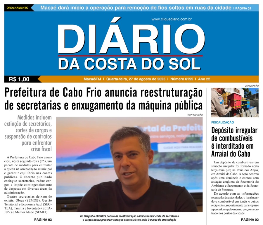 Edições Impressas Edição de quarta-feira 27/08/2025 nº 6155 Publicado em 27/08/2025 - 09:17 Escrito por Redação Notícias relacionadas: Seguinte Edição de quinta-feira 28/08/2025 nº 6156 Anterior Edição de terça-feira 26/08/2025 nº 6154 Redação Notícias Recentes Cabo Frio1 dia atrás Estudantes de Cabo Frio brilham em premiação do projeto CaptaAção Meio Ambiente1 dia atrás Cepro promove encontro para discutir avanços e desafios da justiça climática em Rio das Ostras Armação dos Búzios1 dia atrás Búzios Swim celebra esporte, natureza e turismo na Região dos Lagos Cabo Frio1 dia atrás Educação pública de Cabo Frio colhe frutos com conquistas em competições científicas Edições Impressas1 dia atrás Edição de sábado a segunda-feira 08 a 10/11/2025 nº 6208 Polícia1 dia atrás Moto sem placa é abandonada após fuga de suspeito em Macaé Polícia1 dia atrás Polícia Civil prende homem em flagrante por tráfico de drogas no Parque Aeroporto, em Macaé Iguaba2 dias atrás Menina de Iguaba Grande realiza sonho e conhece o príncipe William no Rio de Janeiro Arraial do cabo2 dias atrás Arraial do Cabo é exemplo de tranquilidade na Região dos Lagos, segundo dados do ISP Arraial do cabo2 dias atrás Festival em Arraial do Cabo promete recorde de público com mais de 15 mil pratos e 10 mil litros de chope Clique Diário E. L. Mídia Editora Ltda CNPJ: 09.298.880/0001-07 Redação: Rua Tupinambás 122 Gloria – Macaé/RJ comercial@diariocs.com (22) 2765-7353 (22) 999253130 Mais lidas da semana Arraial do cabo3 dias atrás Arraial do Cabo celebra 3ª edição do Festival de Frutos do Mar com entrada livre; Carol Biazin, Ramona Rox, Liah Soares e mais Meio Ambiente4 dias atrás Programa do governo estadual promove limpeza de rio no Âncora, em Rio das Ostras Meio Ambiente3 dias atrás Ações do Programa Limpa Rio seguem em vários pontos de Rio das Ostras Cidades5 dias atrás HFM ganha novo Pronto-Socorro moderno e ampliado em Campos