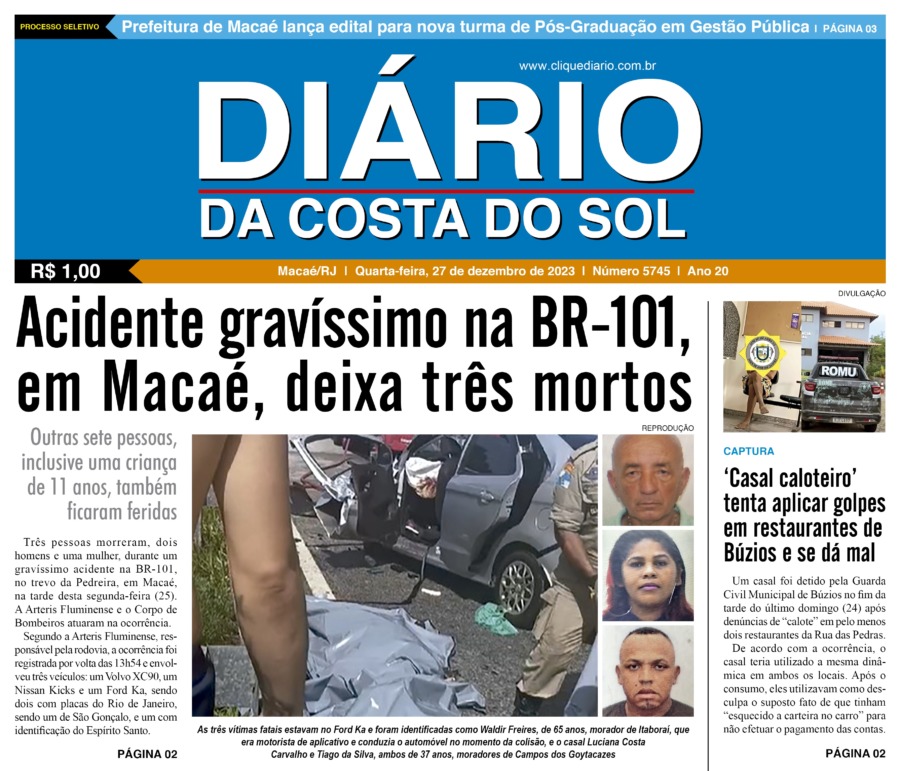 Edições Impressas Edição de quarta-feira 27/12/2023 nº 5745 Publicado em 26/12/2023 - 23:55 Escrito por Redação Notícias relacionadas: Seguinte Edição de quinta-feira 28/12/2023 nº 5746 Anterior Museu Casa Quissamã recebe mais de 500 visitantes um mês após a reabertura Redação Notícias Recentes Cultura11 horas atrás Teatro de Rio das Ostras recebe 2 espetáculos de dança nesse fim de semana Arraial do cabo11 horas atrás FIPAC oferece serviços de saúde e prevenção ao câncer de próstata em Arraial do Cabo Arraial do cabo11 horas atrás Resultado preliminar do concurso de Arraial já está no ar pelo IBAM Edições Impressas12 horas atrás Edição de sábado a segunda-feira 15 a 17/11/2025 nº 6213 Cidades13 horas atrás Shopping Plaza Macaé inicia programação de Natal neste fim de semana Cabo Frio13 horas atrás Disputa em dobro marca encerramento em Cabo Frio do circuito de surf Cabo Frio1 dia atrás Agentes de Cabo Frio recebem novo treinamento técnico para atuar em casos de poluição sonora Cabo Frio1 dia atrás Homem procurado por latrocínio é detido por agentes em Cabo Frio Cabo Frio1 dia atrás Representante da Guarda Civil de Cabo Frio compete na etapa final ao lado de jovens atletas Polícia1 dia atrás Prefeito de Rio das Ostras volta de Brasília com esperança de novos investimentos Clique Diário E. L. Mídia Editora Ltda CNPJ: 09.298.880/0001-07 Redação: Rua Tupinambás 122 Gloria – Macaé/RJ comercial@diariocs.com (22) 2765-7353 (22) 999253130 Mais lidas da semana Cultura1 dia atrás Adilson Lopes apresenta exposição “Trajetória” em Casimiro de Abreu Polícia3 dias atrás Farmácia é interditada e uma pessoa é presa em Rio das Ostras em operação da Polícia Federal Cidades4 dias atrás Servidores de Rio das Ostras participam de treinamento do Estado em Búzios Cidades3 dias atrás Vereadores de Macaé vão embarcar nesta quinta para participar da COP 30 em Belém