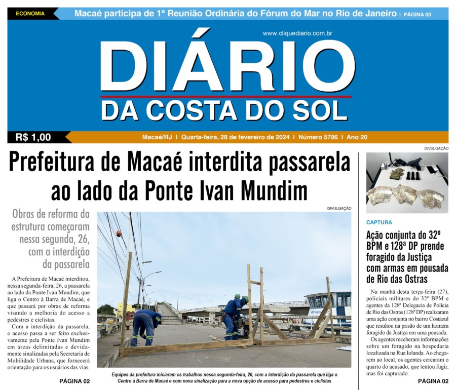 Edições Impressas Edição de quarta-feira 28/02/2024 nº 5786 Publicado em 28/02/2024 - 08:00 Escrito por Redação Notícias relacionadas: Seguinte Edição de quinta-feira 29/02/2024 nº 5787 Anterior Edição de terça-feira 27/02/2024 nº 5785 Redação Notícias Recentes Cabo Frio4 horas atrás Cabo Frio promove ação do projeto Capoeiragem para registro de documentário Sem categoria6 horas atrás Cabo Frio recebe iniciativa que vai orientar Política Estadual do Empreendedorismo Edições Impressas10 horas atrás Edição de quinta e sexta-feira 20 e 21/11/2025 nº 6216 Armação dos Búzios1 dia atrás Búzios atinge 80% de ocupação no feriado Cabo Frio1 dia atrás Cabo Frio prepara esquema especial de segurança nas praias e áreas de lazer Cabo Frio1 dia atrás Cabo Frio realiza ações de proteção a fauna após aparecimento de animais em bairros Cabo Frio1 dia atrás Cabo Frio reúne especialistas em evento do programa “Vim Cuidar de Você” Desenvolvimento1 dia atrás Rio das Ostras estreita relações com a Rede Petro BC de olho em eventos do setor de energia em 2026 Cabo Frio1 dia atrás Aula-passeio apresenta riqueza cultural e ambiental de Cabo Frio na Fazenda Campos Novos Cabo Frio1 dia atrás Cabo Frio suspende expediente em órgãos públicos nesta sexta Clique Diário E. L. Mídia Editora Ltda CNPJ: 09.298.880/0001-07 Redação: Rua Tupinambás 122 Gloria – Macaé/RJ comercial@diariocs.com (22) 2765-7353 (22) 999253130 Mais lidas da semana Desenvolvimento1 dia atrás Rio das Ostras estreita relações com a Rede Petro BC de olho em eventos do setor de energia em 2026 Cabo Frio4 horas atrás Cabo Frio promove ação do projeto Capoeiragem para registro de documentário Cultura6 dias atrás Adilson Lopes apresenta exposição “Trajetória” em Casimiro de Abreu Cultura1 dia atrás Moda e Prosa Caipira tem sua 6ª edição nessa quinta, 20, em Saquarema