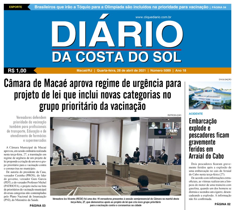 Edições Impressas Edição de quarta-feira 28/04/2021 nº 5089 Publicado em 28/04/2021 - 00:00 Escrito por Fernando Vitor Notícias relacionadas:destaque Seguinte Edição de quinta-feira 29/04/2021 nº 5090 Anterior Edição de terça-feira 27/04/2021 nº 5088 Fernando Vitor Notícias Recentes Cidades10 horas atrás Macaé discute armamento da Guarda Municipal como parte de ações para fortalecer a segurança pública Araruama11 horas atrás Presos em Araruama tinham mandados por roubo e associação criminosa Educação11 horas atrás Inscrição para vagas nas creches de Rio das Ostras em 2026 termina nessa sexta, 14 Cabo Frio11 horas atrás Cabo Frio executa nova etapa de sinalização horizontal na cidade Cidades11 horas atrás Agricultores e pecuaristas de Quissamã participam de encontro de capacitação e orientação técnica Arraial do cabo11 horas atrás Nova licença digital promete mais agilidade e transparência em Arraial do Cabo Polícia11 horas atrás Idoso é assassinado a tiros às margens da BR-101, em Campos Esporte11 horas atrás Atletas de Rio das Ostras e Saquarema conquistam título de brasileiro de bodyboarding Arraial do cabo11 horas atrás Sucesso de vendas faz pratos especiais continuarem até o fim de novembro em Arraial no Festival de Frutos do Mar Cabo Frio11 horas atrás Iniciativa reforça compromisso com a identidade cultural cabo-friense Clique Diário E. L. Mídia Editora Ltda CNPJ: 09.298.880/0001-07 Redação: Rua Tupinambás 122 Gloria – Macaé/RJ comercial@diariocs.com (22) 2765-7353 (22) 999253130 Mais lidas da semana Cidades2 dias atrás Servidores de Rio das Ostras participam de treinamento do Estado em Búzios Polícia2 dias atrás Farmácia é interditada e uma pessoa é presa em Rio das Ostras em operação da Polícia Federal Polícia7 dias atrás Polícia prende 3 homens envolvidos com o tráfico em Rio das Ostras Cidades1 dia atrás Vereadores de Macaé vão embarcar nesta quinta para participar da COP 30 em Belém