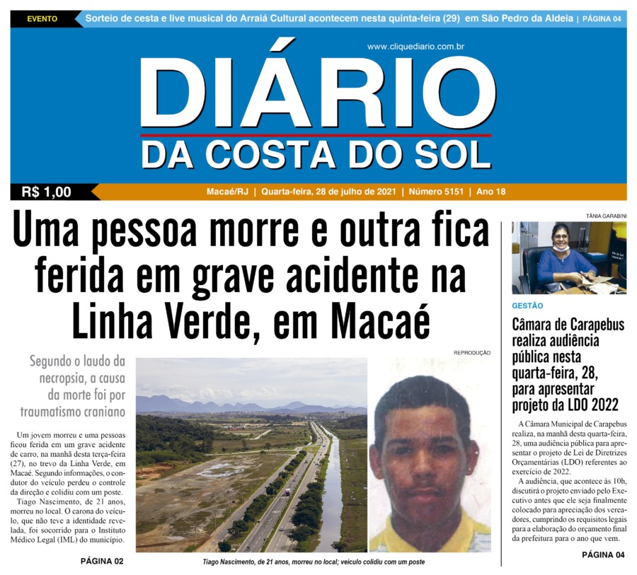Edições Impressas Edição de quarta-feira 28/07/2021 n° 5151 Publicado em 28/07/2021 - 02:57 Escrito por Fernando Vitor Notícias relacionadas: Seguinte Edição de quinta e sexta-feira 29 e 30/07/2021 n° 5152 Anterior Edição de terça-feira 27/07/2021 n° 5150 Fernando Vitor Notícias Recentes Cidades15 horas atrás Macaé registra avanço na coleta seletiva porta a porta e recolhe mais de 2 toneladas em 45 dias Meio Ambiente15 horas atrás Lagoa de Iriry, em Rio das Ostras, recebe nova sinalização focada em sustentabilidade Araruama15 horas atrás Araruama busca ampliar diálogo sobre saneamento antes de concluir revisão do PMSB Cabo Frio15 horas atrás Câmeras flagram colisão no restaurante Tia maluca seguida de fuga no Centro de Cabo Frio Cabo Frio15 horas atrás Cabo Frio reforça proteção ambiental após depredação na Trilha Translagunar Cabo Frio16 horas atrás Cabo Frio reúne especialistas para debater estratégias de enfrentamento às drogas Polícia16 horas atrás Homem morre e outro fica ferido em ataque a tiros em Travessão, em Campos dos Goytacazes Polícia16 horas atrás Polícia prende 2 homens em operação contra o tráfico de drogas em Rio das Ostras Arraial do cabo16 horas atrás Ação da Guarda Municipal e COMTRANS em Arraial coíbe prática perigosa em área turística Arraial do cabo16 horas atrás Município de Arraial organiza atividade crescente e amplia controle das rotas Clique Diário E. L. Mídia Editora Ltda CNPJ: 09.298.880/0001-07 Redação: Rua Tupinambás 122 Gloria – Macaé/RJ comercial@diariocs.com (22) 2765-7353 (22) 999253130 Mais lidas da semana Cultura4 dias atrás Adilson Lopes apresenta exposição “Trajetória” em Casimiro de Abreu Polícia6 dias atrás Farmácia é interditada e uma pessoa é presa em Rio das Ostras em operação da Polícia Federal Cidades7 dias atrás Servidores de Rio das Ostras participam de treinamento do Estado em Búzios Edições Impressas6 dias atrás Edição de quarta-feira 12/11/2025 nº 6210