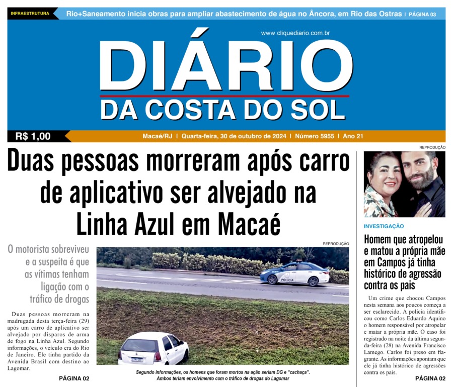 Edições Impressas Edição de quarta-feira 30/10/2024 nº 5955 Publicado em 29/10/2024 - 23:55 Escrito por Redação Notícias relacionadas: Seguinte Edição de quinta-feira 31/10/2024 nº 5956 Anterior Edição de terça-feira 29/10/2024 nº 5954 Redação Notícias Recentes Cidades10 horas atrás Macaé realizou 5ª Corrida e Caminhada Outubro Rosa Novembro Azul na orla da Imbetiba Cidades10 horas atrás Rio das Ostras autua Rio+ por mais um caso de vazamento de esgoto na cidade Cabo Frio11 horas atrás Ação da Prefeitura e AAMA leva reflexão sobre autocuidado e prevenção do câncer de mama em Cabo Frio Cidades11 horas atrás Casa do Servidor em Macaé ultrapassa 7 mil atendimentos em oito meses de funcionamento Polícia11 horas atrás Foragido da Justiça é preso pela PM na BR-101 em Campos Araruama11 horas atrás Prefeitura define plano de segurança integrado para a Expo Araruama Iguaba11 horas atrás Prefeitura de Iguaba Grande prepara nova turma de aprendizes para atuação em órgãos públicos Cabo Frio11 horas atrás Mostra de Dança movimenta Cabo Frio com apresentações, solidariedade e cultura local Cabo Frio11 horas atrás Cabo Frio dá início à formação obrigatória para ambulantes das praias Polícia11 horas atrás Homem é preso com rádios transmissores em depósito de Casimiro de Abreu Clique Diário E. L. Mídia Editora Ltda CNPJ: 09.298.880/0001-07 Redação: Rua Tupinambás 122 Gloria – Macaé/RJ comercial@diariocs.com (22) 2765-7353 (22) 999253130 Mais lidas da semana Cultura7 dias atrás Música, emoção e cores: Rodrigo Pontes apresenta show especial em Rio das Ostras Edições Impressas6 dias atrás Edição de quarta-feira 22/10/2025 nº 6195 Edições Impressas5 dias atrás Edição de quinta-feira 23/10/2025 nº 6196 Cidadania4 dias atrás Plano Diretor de Rio das Ostras é tema de fórum da sociedade civil nesse sábado, 25