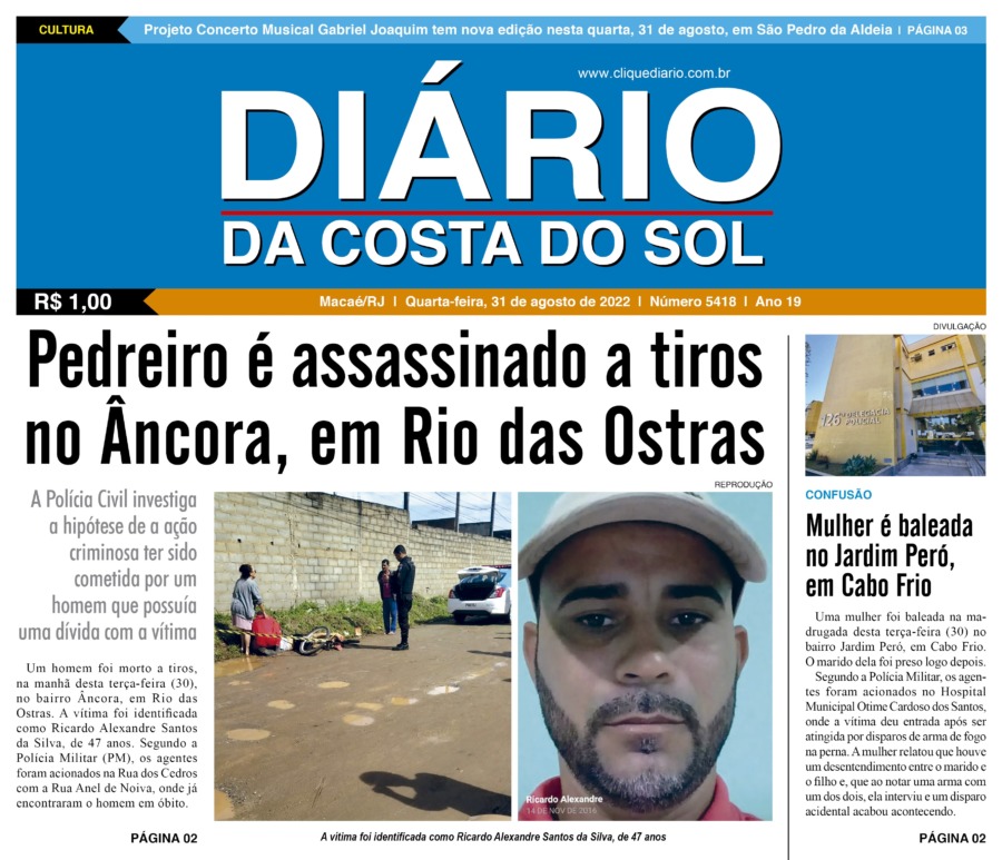Edições Impressas Edição de quarta-feira 31/08/2022 nº 5418 Publicado em 31/08/2022 - 03:22 Escrito por Fernando Vitor Notícias relacionadas: Seguinte Edição de quinta-feira 01/09/2022 nº 5419 Anterior Edição de terça-feira 30/08/2022 nº 5417 Fernando Vitor Notícias Recentes Polícia26 minutos atrás Polícia prende homem que extorquia motoristas de vans em Rio das Ostras Cidades1 hora atrás Unimed Costa do Sol fortalece maternidade de alta complexidade e supera índices nacionais Polícia2 horas atrás Polícia Civil de Macaé prende suspeito de tentativa de latrocínio ocorrido em 2023 Cidades3 horas atrás Macaé intensifica campanha e anuncia Dia D para doação de sangue em 29 de novembro Lazer4 horas atrás Evento marca abertura do Natal em Silva Jardim nessa quarta-feira, 19 Polícia4 horas atrás Casal é preso com grande quantidade de drogas em ação da PM em Rio das Ostras Oportunidade5 horas atrás Banco de Empregos abre semana com 660 vagas para contração imediata em Rio das Ostras Cabo Frio1 dia atrás Cabo Frio antecipa a Black Friday com grandes marcas e atrações musicais Cidades1 dia atrás Procon de Rio das Ostras investiga denúncias de cobrança dupla na Enel Cidades1 dia atrás Macaé sediará o 8º Encontro Fluminense de Arborização Urbana em dezembro Clique Diário E. L. Mídia Editora Ltda CNPJ: 09.298.880/0001-07 Redação: Rua Tupinambás 122 Gloria – Macaé/RJ comercial@diariocs.com (22) 2765-7353 (22) 999253130 Mais lidas da semana Cultura3 dias atrás Adilson Lopes apresenta exposição “Trajetória” em Casimiro de Abreu Cidades6 dias atrás Servidores de Rio das Ostras participam de treinamento do Estado em Búzios Polícia5 dias atrás Farmácia é interditada e uma pessoa é presa em Rio das Ostras em operação da Polícia Federal Cidades4 dias atrás Macaé é finalista no Festival Internacional de Cinema Cristão com “A Paixão de Cristo”