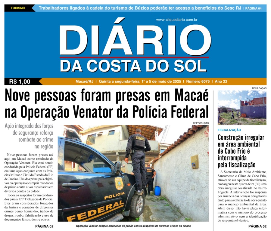 Edições Impressas Edição de quinta a segunda-feira 01 a 05/05/2025 nº 6075 Publicado em 01/05/2025 - 08:51 Escrito por Redação Notícias relacionadas: Seguinte Edição de terça-feira 06/05/2025 nº 6076 Anterior Edição de quarta-feira 30/04/2025 nº 6074 Redação Notícias Recentes Cultura10 horas atrás Espetáculo “O Mágico de Oz” retorna aos palcos de Rio das Ostras nesse domingo, 2 Sem categoria10 horas atrás Macaé abre inscrições para a terceira edição da Semana Empreendedora Cidades1 dia atrás Rio das Ostras prepara cemitérios da cidade para o feriado de Finados nesse domingo, 2 Edições Impressas1 dia atrás Edição de sábado a segunda-feira 01 a 03/11/2025 nº 6203 Cidades1 dia atrás Macaé tem fim de semana repleto de competições esportivas Araruama2 dias atrás Expo Araruama 2025 promete fim de semana de música, cultura e sabor no Parque da Fazendinha Cabo Frio2 dias atrás Forças de segurança intensificam combate ao tráfico e prendem dupla de Cabo Frio Infraestrutura2 dias atrás Equipes de serviços públicos segue atuando em vários pontos de Rio das Ostras Arraial do cabo2 dias atrás Educação, inovação e meio ambiente se encontram na Arraial EXPO XP 2025 Cidades2 dias atrás Quissamã realiza entrega de certificados a visitadoras do Programa Criança Feliz Clique Diário E. L. Mídia Editora Ltda CNPJ: 09.298.880/0001-07 Redação: Rua Tupinambás 122 Gloria – Macaé/RJ comercial@diariocs.com (22) 2765-7353 (22) 999253130 Mais lidas da semana Arraial do cabo4 dias atrás Castração sem custo é retomada em Arraial do Cabo para controle populacional de gatos Polícia6 dias atrás Polícia descobre esconderijo do tráfico e apreende grande quantidade de drogas em Macaé Cultura4 dias atrás Prédio da Onda, em Rio das Ostras, recebe oficina teatral gratuita a partir dessa quinta, 30 Cidades4 dias atrás Silva Jardim tem evento do Outubro Rosa nessa quinta, 30, no Teatro