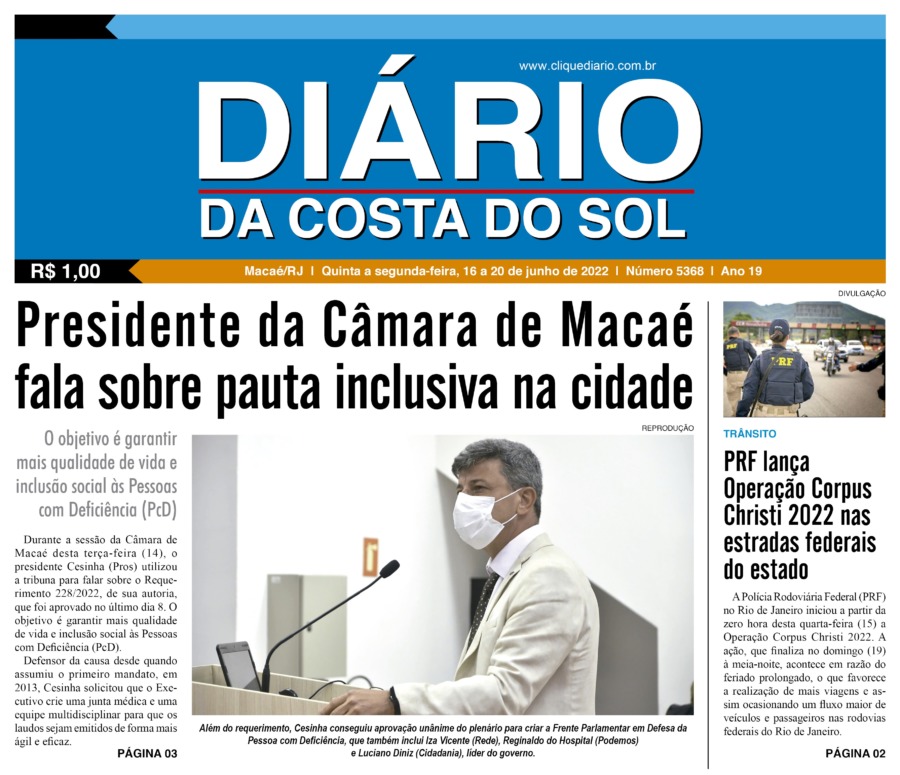 Edições Impressas Edição de quinta a segunda-feira 16 a 20/06/2022 nº 5368 Publicado em 15/06/2022 - 23:55 Escrito por Fernando Vitor Notícias relacionadas: Seguinte Edição de terça-feira 21/06/2022 nº 5369 Anterior Edição de quarta-feira 15/06/2022 nº 5367 Fernando Vitor Notícias Recentes Arraial do cabo8 horas atrás Educação de Arraial do Cabo orienta responsáveis sobre rematrícula para o próximo ano Cabo Frio8 horas atrás Evento comercial mais aguardado de Cabo Frio atinge 100% de estandes vendidos Saúde9 horas atrás Rio das Ostras comemora melhorias no atendimento da saúde municipal Cabo Frio9 horas atrás Nova exposição no Palácio das Águias recebe homenagem da cultura negra em Cabo Frio com 44 obras Arraial do cabo9 horas atrás A FIPAC em Arraial do Cabo alerta operadores náuticos: regularizem suas embarcações Comércio9 horas atrás Sindicomércio anuncia abertura do Natal Sesc 2025 em Rio das Ostras e Casimiro de Abreu Polícia10 horas atrás Polícia apreende drogas no Lagomar após varredura motivada por denúncia Polícia10 horas atrás Operação do GAT do 32º BPM apreende drogas, dinheiro e moto sem placa na Favela da Linha Desenvolvimento10 horas atrás Silva Jardim realiza audiência pública de revisão do seu Plano de Saneamento Básico Arraial do cabo12 horas atrás O poder da natureza e da memória em telas na mostra de Fransciscone Araújo em Arraial do Cabo Clique Diário E. L. Mídia Editora Ltda CNPJ: 09.298.880/0001-07 Redação: Rua Tupinambás 122 Gloria – Macaé/RJ comercial@diariocs.com (22) 2765-7353 (22) 999253130 Mais lidas da semana Cultura5 dias atrás Adilson Lopes apresenta exposição “Trajetória” em Casimiro de Abreu Polícia7 dias atrás Farmácia é interditada e uma pessoa é presa em Rio das Ostras em operação da Polícia Federal Meio Ambiente1 dia atrás Lagoa de Iriry, em Rio das Ostras, recebe nova sinalização focada em sustentabilidade Cidades1 dia atrás Macaé registra avanço na coleta seletiva porta a porta e recolhe mais de 2 toneladas em 45 dias