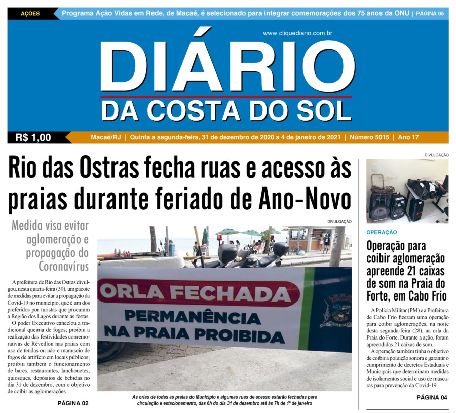 Edições Impressas Edição de quinta a segunda-feira 31/12/2020 a 04/01/2021 nº 5015 Publicado em 31/12/2020 - 04:10 Escrito por Fernando Vitor Notícias relacionadas:destaque Seguinte Edição de terça-feira 05/01/2021 nº 5016 Anterior Edição de quarta-feira 30/12/2020 nº 5014 Fernando Vitor Notícias Recentes Cidades24 minutos atrás Casa do Educador de Saquarema recebe audiência pública nessa quarta, 12 Polícia1 hora atrás Equipe da Guarda de Cabo Frio recupera pertences levados de carro estacionado Educação2 horas atrás Basquete, queimado, dama e xadrez marcam em Cabo Frio o fim dos Jogos Estudantis Municipais Emprego3 horas atrás Prefeitura de Cabo Frio investe em qualificação e sustentabilidade Polícia4 horas atrás Adolescente é detida em Maricá em ação que apreendeu grande quantidade de drogas Polícia4 horas atrás Polícia apreende drogas em caixa de energia de casa em Rio das Ostras Comércio5 horas atrás Plaza Rio das Ostras anuncia chegada do Papai Noel e programação de Natal Polícia5 horas atrás Ação do GAT do 32º BPM termina com apreensão de drogas e prisão de suspeito na Aroeira, em Macaé Polícia5 horas atrás Moto roubada é recuperada em Macaé durante ação conjunta entre PM e Mobilidade Urbana Polícia5 horas atrás Polícia Militar apreende fuzil e drogas em operação na comunidade das Malvinas, em Macaé Clique Diário E. L. Mídia Editora Ltda CNPJ: 09.298.880/0001-07 Redação: Rua Tupinambás 122 Gloria – Macaé/RJ comercial@diariocs.com (22) 2765-7353 (22) 999253130 Mais lidas da semana Arraial do cabo4 dias atrás Arraial do Cabo celebra 3ª edição do Festival de Frutos do Mar com entrada livre; Carol Biazin, Ramona Rox, Liah Soares e mais Turismo7 dias atrás Saquarema celebra reconhecimento de projeto pelo Ministério do Turismo Educação6 dias atrás Estudantes de Rio das Ostras são destaques em evento nacional da Educação Cidades6 dias atrás HFM ganha novo Pronto-Socorro moderno e ampliado em Campos