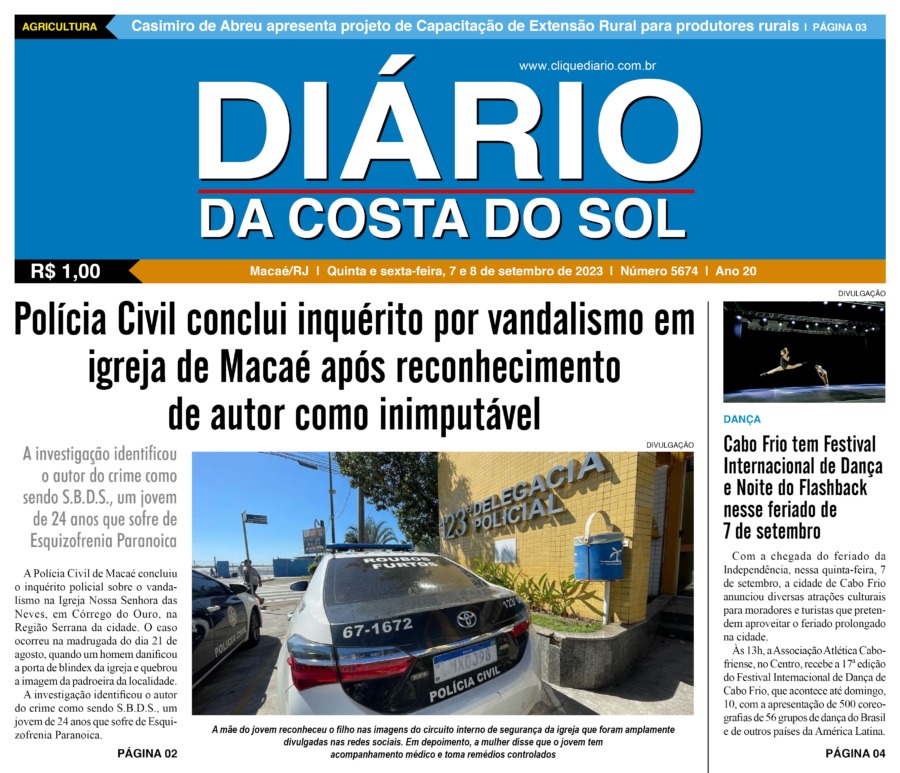 Edições Impressas Edição de quinta e sexta-feira 07 e 08/09/2023 nº 5674 Publicado em 06/09/2023 - 23:55 Escrito por Redação Notícias relacionadas: Seguinte Edição de sábado a segunda-feira 09 a 11/09/2023 nº 5675 Anterior Edição de quarta-feira 06/09/2023 nº 5673 Redação Notícias Recentes Cabo Frio1 dia atrás Estudantes de Cabo Frio brilham em premiação do projeto CaptaAção Meio Ambiente1 dia atrás Cepro promove encontro para discutir avanços e desafios da justiça climática em Rio das Ostras Armação dos Búzios1 dia atrás Búzios Swim celebra esporte, natureza e turismo na Região dos Lagos Cabo Frio1 dia atrás Educação pública de Cabo Frio colhe frutos com conquistas em competições científicas Edições Impressas1 dia atrás Edição de sábado a segunda-feira 08 a 10/11/2025 nº 6208 Polícia1 dia atrás Moto sem placa é abandonada após fuga de suspeito em Macaé Polícia1 dia atrás Polícia Civil prende homem em flagrante por tráfico de drogas no Parque Aeroporto, em Macaé Iguaba2 dias atrás Menina de Iguaba Grande realiza sonho e conhece o príncipe William no Rio de Janeiro Arraial do cabo2 dias atrás Arraial do Cabo é exemplo de tranquilidade na Região dos Lagos, segundo dados do ISP Arraial do cabo2 dias atrás Festival em Arraial do Cabo promete recorde de público com mais de 15 mil pratos e 10 mil litros de chope Clique Diário E. L. Mídia Editora Ltda CNPJ: 09.298.880/0001-07 Redação: Rua Tupinambás 122 Gloria – Macaé/RJ comercial@diariocs.com (22) 2765-7353 (22) 999253130 Mais lidas da semana Arraial do cabo3 dias atrás Arraial do Cabo celebra 3ª edição do Festival de Frutos do Mar com entrada livre; Carol Biazin, Ramona Rox, Liah Soares e mais Meio Ambiente4 dias atrás Programa do governo estadual promove limpeza de rio no Âncora, em Rio das Ostras Meio Ambiente3 dias atrás Ações do Programa Limpa Rio seguem em vários pontos de Rio das Ostras Cidades5 dias atrás HFM ganha novo Pronto-Socorro moderno e ampliado em Campos