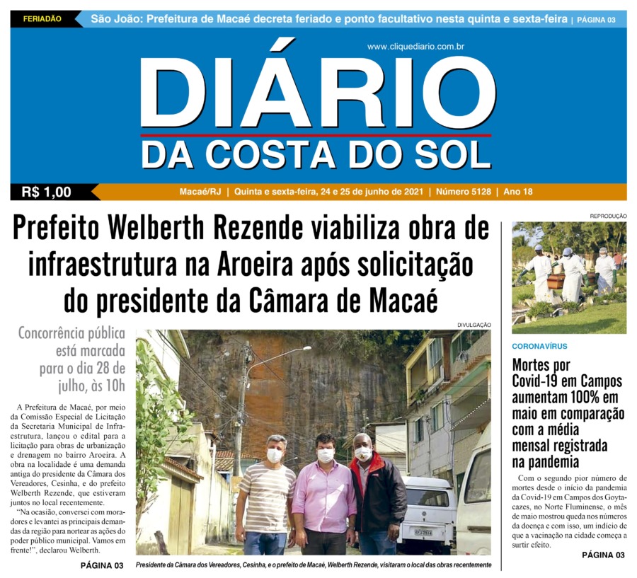 Edições Impressas Edição de quinta e sexta-feira 24 e 25/06/2021 nº 5128 Publicado em 24/06/2021 - 00:00 Escrito por Fernando Vitor Notícias relacionadas:destaque Seguinte Edição de sábado a segunda-feira 26 a 28/06/2021 nº 5129 Anterior Edição de quarta-feira 23/06/2021 n° 5127 Fernando Vitor Notícias Recentes Cabo Frio1 hora atrás Cabo Frio antecipa a Black Friday com grandes marcas e atrações musicais Cidades4 horas atrás Procon de Rio das Ostras investiga denúncias de cobrança dupla na Enel Cidades7 horas atrás Macaé sediará o 8º Encontro Fluminense de Arborização Urbana em dezembro Cultura1 dia atrás Teatro de Rio das Ostras recebe 2 espetáculos de dança nesse fim de semana Arraial do cabo1 dia atrás FIPAC oferece serviços de saúde e prevenção ao câncer de próstata em Arraial do Cabo Arraial do cabo1 dia atrás Resultado preliminar do concurso de Arraial já está no ar pelo IBAM Edições Impressas1 dia atrás Edição de sábado a segunda-feira 15 a 17/11/2025 nº 6213 Cidades1 dia atrás Shopping Plaza Macaé inicia programação de Natal neste fim de semana Cabo Frio1 dia atrás Disputa em dobro marca encerramento em Cabo Frio do circuito de surf Cabo Frio2 dias atrás Agentes de Cabo Frio recebem novo treinamento técnico para atuar em casos de poluição sonora Clique Diário E. L. Mídia Editora Ltda CNPJ: 09.298.880/0001-07 Redação: Rua Tupinambás 122 Gloria – Macaé/RJ comercial@diariocs.com (22) 2765-7353 (22) 999253130 Mais lidas da semana Cultura2 dias atrás Adilson Lopes apresenta exposição “Trajetória” em Casimiro de Abreu Cidades5 dias atrás Servidores de Rio das Ostras participam de treinamento do Estado em Búzios Polícia4 dias atrás Farmácia é interditada e uma pessoa é presa em Rio das Ostras em operação da Polícia Federal Esporte2 dias atrás De Saquarema para o Brasileirão: Vasco troca gramado de São Januário