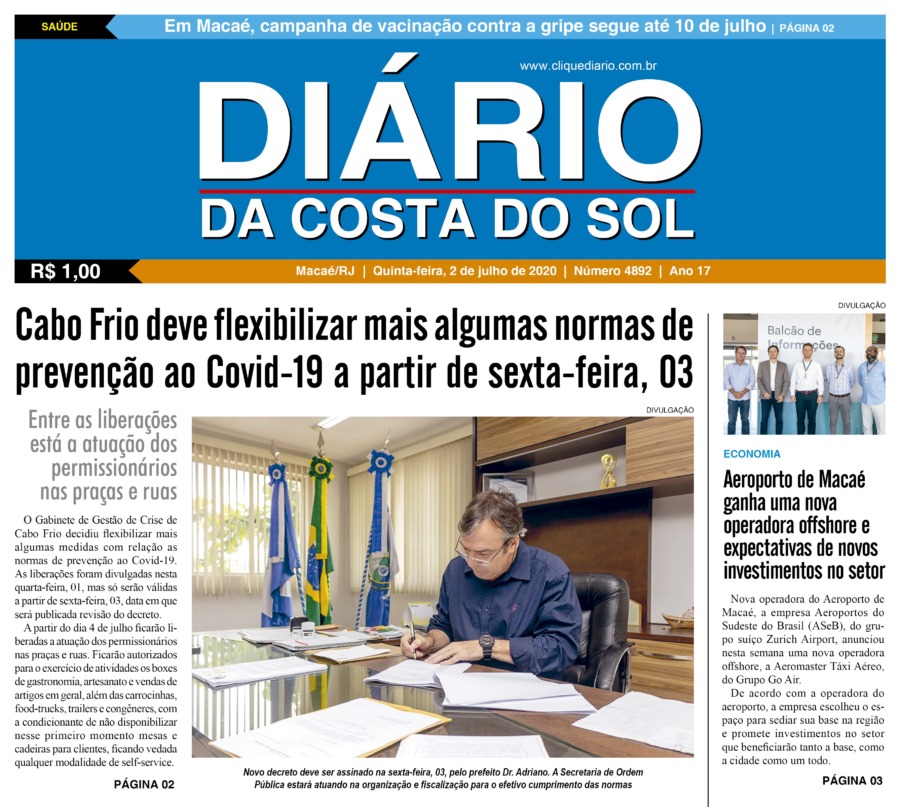 Edições Impressas Edição de quinta-feira 02/07/2020 nº 4892 Publicado em 02/07/2020 - 05:00 Escrito por Fernando Vitor Notícias relacionadas: Seguinte Edição de sexta-feira 03/06/2020 nº 4893 Anterior Edição de quarta-feira 01/07/2020 nº 4891 Fernando Vitor Notícias Recentes Polícia9 minutos atrás Traficante é preso em Macaé após perseguição policial no Parque Aeroporto Polícia11 minutos atrás Polícia prende suspeito e recupera carro roubado de madrugada em Rio das Ostras Cabo Frio21 horas atrás Arte e solidariedade marcam a 1ª Mostra de Dança Regional de Tamoios Cidades1 dia atrás Região serrana de Macaé recebe 1º X-Force Passeio de Quadriciclo e Aranha neste domingo (26) Polícia1 dia atrás Polícia apreende mais de meio quilo de drogas no Loteamento São João, em Rio das Ostras Saúde2 dias atrás Eventos esportivo e cultural reforça campanha do Outubro Rosa em Rio das Ostras nesse domingo, 26 Edições Impressas2 dias atrás Sábado a segunda-feira 25 a 27/10/2025 nº 6197 Cidades2 dias atrás Shopping Plaza Macaé oferece programação gratuita com feira de adoção e show de pagode neste fim de semana Cidades3 dias atrás 32º BPM completa 23 anos com solenidade de celebração e reconhecimento aos policiais Armação dos Búzios3 dias atrás Búzios celebra esporte e superação com XC RUN 2025 Clique Diário E. L. Mídia Editora Ltda CNPJ: 09.298.880/0001-07 Redação: Rua Tupinambás 122 Gloria – Macaé/RJ comercial@diariocs.com (22) 2765-7353 (22) 999253130 Mais lidas da semana Cultura7 dias atrás Silva Jardim anuncia shows gratuitos de samba e pagode para o fim de semana Cabo Frio7 dias atrás Serviços essenciais permanecem ativos durante ponto facultativo em Cabo Frio Arraial do cabo7 dias atrás Prisão em flagrante marca operação da Patrulha Maria da Penha em Arraial do Cabo Polícia7 dias atrás Policiais da PRF salvam bebê engasgado na BR-101, em Campos