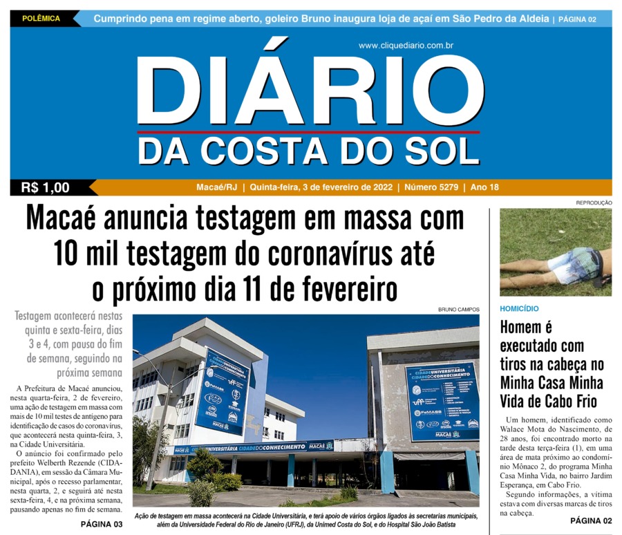 Edições Impressas Edição de quinta-feira 03/02/2022 nº 5279 Publicado em 02/02/2022 - 23:58 Escrito por Fernando Vitor Notícias relacionadas: Seguinte Edição de sexta-feira 04/02/2022 nº 5280 Anterior Edição de quarta-feira 02/02/2022 nº 5278 Fernando Vitor Notícias Recentes Cultura17 minutos atrás Feriado da Consciência Negra tem programação em Rio das Ostras nessa quinta, 20 Cidadania46 minutos atrás Distrito de Casimiro de Abreu recebe Programa RJ para Todos, do governo estadual Cultura3 horas atrás Moda e Prosa Caipira tem sua 6ª edição nessa quinta, 20, em Saquarema Comércio4 horas atrás Rio das Ostras tem 19ª edição de sua tradicional feira outlet nesse feriado Cidades4 horas atrás Macaé recebe 20ª edição do Prefeitura Presente no dia 25 de novembro Polícia5 horas atrás Denúncia anônima leva à prisão de duas mulheres por tráfico em Macaé Cidades5 horas atrás Caravana de Natal Coca-Cola passa por Rio das Ostras e Casimiro de Abreu nessa quinta, 20 Edições Impressas7 horas atrás Edição de quarta-feira 19/11/2025 nº 6215 Arraial do cabo23 horas atrás Educação de Arraial do Cabo orienta responsáveis sobre rematrícula para o próximo ano Cabo Frio23 horas atrás Evento comercial mais aguardado de Cabo Frio atinge 100% de estandes vendidos Clique Diário E. L. Mídia Editora Ltda CNPJ: 09.298.880/0001-07 Redação: Rua Tupinambás 122 Gloria – Macaé/RJ comercial@diariocs.com (22) 2765-7353 (22) 999253130 Mais lidas da semana Cultura5 dias atrás Adilson Lopes apresenta exposição “Trajetória” em Casimiro de Abreu Mobilidade5 dias atrás Mobilidade promove fiscalização para verificar situação de táxis em Rio das Ostras Cidades6 dias atrás Macaé é finalista no Festival Internacional de Cinema Cristão com “A Paixão de Cristo” Esporte5 dias atrás De Saquarema para o Brasileirão: Vasco troca gramado de São Januário