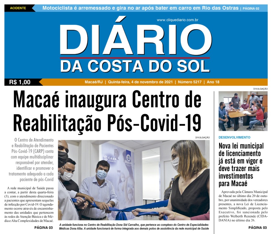 Edições Impressas Edição de quinta-feira 04/11/2021 nº 5217 Publicado em 04/11/2021 - 00:01 Escrito por Fernando Vitor Notícias relacionadas: Seguinte Edição de sexta-feira 05/11/2021 nº 5218 Anterior Edição de sábado a quarta-feira 30/10 a 03/11/2021 nº 5216 Fernando Vitor Notícias Recentes Armação dos Búzios13 horas atrás Búzios atinge 80% de ocupação no feriado Cabo Frio14 horas atrás Cabo Frio prepara esquema especial de segurança nas praias e áreas de lazer Cabo Frio14 horas atrás Cabo Frio realiza ações de proteção a fauna após aparecimento de animais em bairros Cabo Frio14 horas atrás Cabo Frio reúne especialistas em evento do programa “Vim Cuidar de Você” Desenvolvimento14 horas atrás Rio das Ostras estreita relações com a Rede Petro BC de olho em eventos do setor de energia em 2026 Cabo Frio14 horas atrás Aula-passeio apresenta riqueza cultural e ambiental de Cabo Frio na Fazenda Campos Novos Cabo Frio14 horas atrás Cabo Frio suspende expediente em órgãos públicos nesta sexta Cidades14 horas atrás Macaé terá Dia do Futebol Feminino e programa para valorização da mulher rural Arraial do cabo14 horas atrás Carreta científica desembarca em Arraial do Cabo com programação gratuita Polícia15 horas atrás Polícia Civil prende liderança do ADA no bairro Fronteira em Macaé Clique Diário E. L. Mídia Editora Ltda CNPJ: 09.298.880/0001-07 Redação: Rua Tupinambás 122 Gloria – Macaé/RJ comercial@diariocs.com (22) 2765-7353 (22) 999253130 Mais lidas da semana Cultura6 dias atrás Adilson Lopes apresenta exposição “Trajetória” em Casimiro de Abreu Desenvolvimento14 horas atrás Rio das Ostras estreita relações com a Rede Petro BC de olho em eventos do setor de energia em 2026 Cidades3 dias atrás Macaé registra avanço na coleta seletiva porta a porta e recolhe mais de 2 toneladas em 45 dias Mobilidade6 dias atrás Mobilidade promove fiscalização para verificar situação de táxis em Rio das Ostras