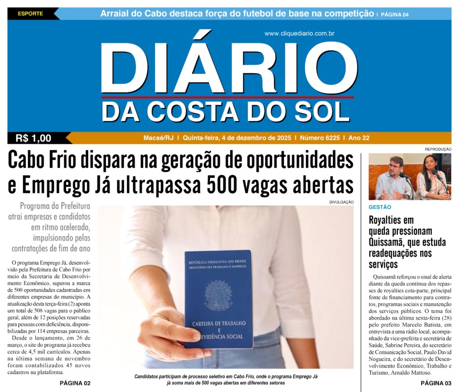 Edições Impressas Edição de quinta-feira 04/12/2025 nº 6225 Publicado em 04/12/2025 - 09:27 Escrito por Redação Notícias relacionadas: Anterior Edição de quarta-feira 03/12/2025 nº 6224 Redação Notícias Recentes Cidades30 minutos atrás Macaé anuncia programação inclusiva no Natal Magia e Águas Dançantes Polícia45 minutos atrás PM remove barricadas e libera vias no bairro Âncora, em Rio das Ostras Polícia54 minutos atrás Ação do GAT desarticula ponto de tráfico da ADA em Macaé Polícia1 hora atrás Polícia Militar desmonta ponto de venda de drogas em Conceição de Macabu Polícia1 hora atrás Ação da Polícia Civil em Macaé termina com um preso e dois menores apreendidos por tráfico Edições Impressas2 horas atrás Edição de quinta-feira 04/12/2025 nº 6225 Armação dos Búzios19 horas atrás Búzios movimenta Geribá e Rua das Pedras com esporte e evento vintage Polícia20 horas atrás Polícia recupera veículo roubado após denúncia anônima em Macaé Polícia20 horas atrás Jeep Compass clonado é apreendido durante patrulhamento em Macaé Iguaba20 horas atrás Iguaba Grande prepara virada com show gratuito na Praça da Estação Clique Diário E. L. Mídia Editora Ltda CNPJ: 09.298.880/0001-07 Redação: Rua Tupinambás 122 Gloria – Macaé/RJ comercial@diariocs.com (22) 2765-7353 (22) 999253130 Mais lidas da semana Cidades6 dias atrás Macaé abre programação do Natal Magia com grande público na Praia Campista Cidades6 dias atrás Moradora de Rio das Ostras é destaque de programa de TV de Cissa Guimarães Cidades6 dias atrás Silva Jardim promove Edição Novembro Azul da Feira de Agricultura Familiar Arraial do cabo2 dias atrás Arraial do Cabo incentiva acesso à arte com apresentações solidárias