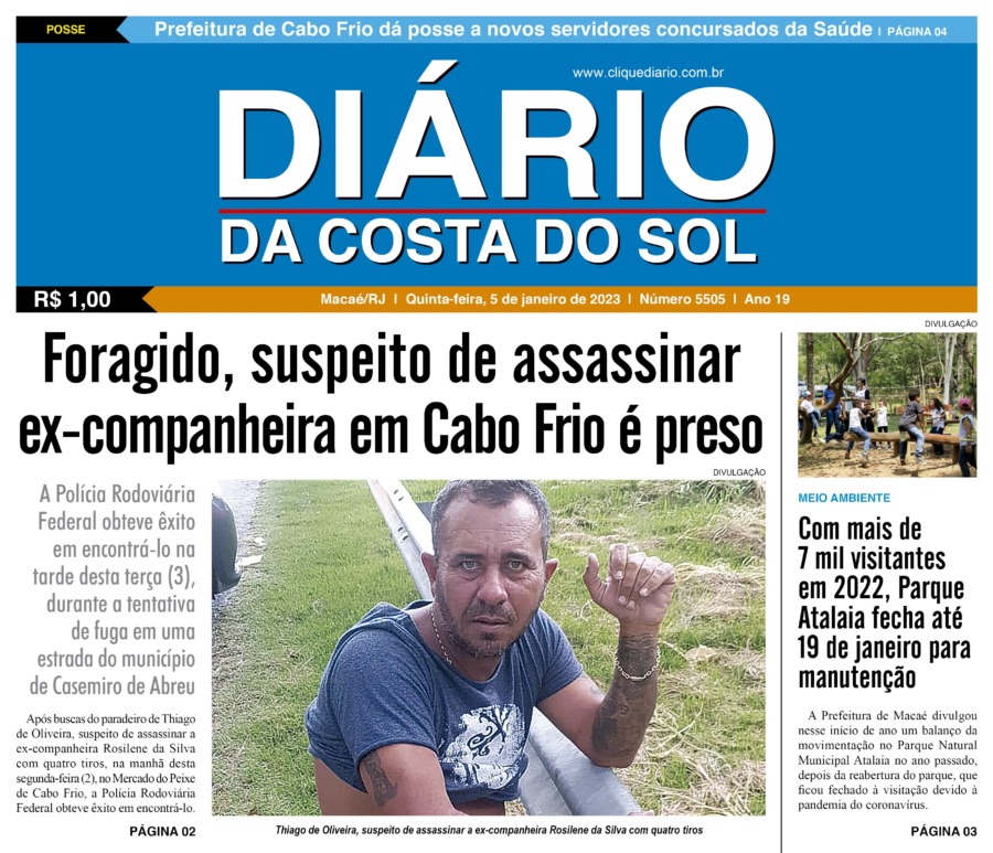 Edições Impressas Edição de quinta-feira 05/01/2023 nº 5505 Publicado em 05/01/2023 - 00:00 Escrito por Redação Notícias relacionadas: Seguinte Edição de sexta-feira 06/01/2023 nº 5506 Anterior Edição de quarta-feira 04/01/2023 nº 5504 Redação Notícias Recentes Cidades35 minutos atrás Mulheres de Saquarema participam de atividade lúdica sobre autoconhecimento Diversão1 hora atrás Silva Jardim celebra o Mês das Crianças com mais uma atividade no Centro Polícia1 hora atrás Polícia descobre esconderijo do tráfico e apreende grande quantidade de drogas em Macaé Polícia2 horas atrás Homem é preso com 105 cápsulas de cocaína em localidade de Rio das Ostras Polícia2 horas atrás Criminoso foge após perseguição e drogas são apreendidas em Macaé Polícia2 horas atrás Traficante é preso em Macaé após perseguição policial no Parque Aeroporto Polícia2 horas atrás Polícia prende suspeito e recupera carro roubado de madrugada em Rio das Ostras Cabo Frio22 horas atrás Arte e solidariedade marcam a 1ª Mostra de Dança Regional de Tamoios Cidades1 dia atrás Região serrana de Macaé recebe 1º X-Force Passeio de Quadriciclo e Aranha neste domingo (26) Polícia1 dia atrás Polícia apreende mais de meio quilo de drogas no Loteamento São João, em Rio das Ostras Clique Diário E. L. Mídia Editora Ltda CNPJ: 09.298.880/0001-07 Redação: Rua Tupinambás 122 Gloria – Macaé/RJ comercial@diariocs.com (22) 2765-7353 (22) 999253130 Mais lidas da semana Cultura7 dias atrás Silva Jardim anuncia shows gratuitos de samba e pagode para o fim de semana Edições Impressas5 dias atrás Edição de quarta-feira 22/10/2025 nº 6195 Cultura6 dias atrás Música, emoção e cores: Rodrigo Pontes apresenta show especial em Rio das Ostras Arraial do cabo7 dias atrás Prisão em flagrante marca operação da Patrulha Maria da Penha em Arraial do Cabo