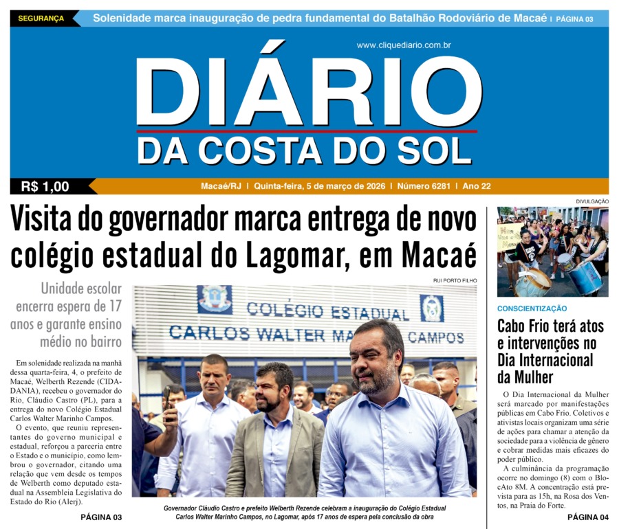 Edições Impressas Edição de quinta-feira 05/03/2026 nº 6281 Publicado em 05/03/2026 - 09:34 Escrito por Redação Notícias relacionadas: Anterior Edição de quarta-feira 04/03/2026 nº 6280 Redação Notícias Recentes Oportunidade7 minutos atrás Pré-inscrição em cursos de qualificação profissional de Macaé termina nessa quinta, 5 Cidades49 minutos atrás Macaé desmente fake news sobre suposta apreensão irregular de bicicletas Edições Impressas1 hora atrás Edição de quinta-feira 05/03/2026 nº 6281 São Pedro da Aldeia18 horas atrás Consumidores de São Pedro da Aldeia terão dois dias para negociar pendências financeiras São Pedro da Aldeia18 horas atrás Feira de Adoção animal fortalece políticas de proteção animal em São Pedro da Aldeia neste fim de semana Cabo Frio18 horas atrás Criminosos invadem loja de salgados em Cabo Frio durante a madrugada Cabo Frio18 horas atrás Cabo Frio terá atos e intervenções no Dia Internacional da Mulher Segurança Pública19 horas atrás Solenidade marca inauguração de pedra fundamental do Batalhão Rodoviário de Macaé Cidades19 horas atrás Rio das Ostras tem reunião de planejamento para lidar com estragos provocados pelas chuvas Mobilidade20 horas atrás Macaé inicia operação de linha de ônibus entre Cabeceira do Sana e Frade Clique Diário E. L. Mídia Editora Ltda CNPJ: 09.298.880/0001-07 Redação: Rua Tupinambás 122 Gloria – Macaé/RJ comercial@diariocs.com (22) 2765-7353 (22) 999253130 Mais lidas da semana Educação23 horas atrás Visita do governador marca entrega de novo colégio estadual do Lagomar, em Macaé Cidades6 dias atrás Macaé mantém estado de alerta após fortes chuvas Araruama5 dias atrás Município de Araruama reforça que não contabiliza notificações de mpox Polícia3 dias atrás Homem é preso por tráfico após denúncia de moradores em Rio das Ostras