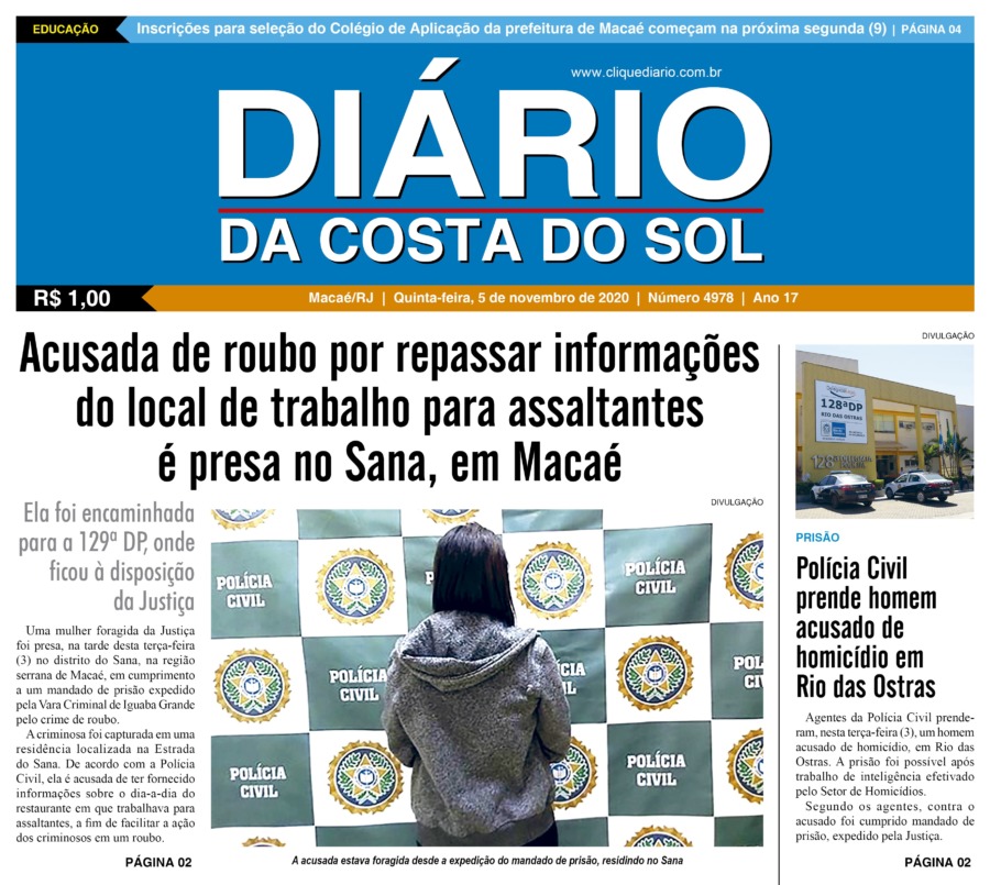 Edições Impressas Edição de quinta-feira 05/11/2020 nº 4978 Publicado em 05/11/2020 - 01:20 Escrito por Fernando Vitor Notícias relacionadas:destaque Seguinte Edição de sexta-feira 06/11/2020 nº 4979 Anterior Edição de quarta-feira 04/11/2020 nº 4977 Fernando Vitor Notícias Recentes São Pedro da Aldeia29 minutos atrás Feirão de Empregabilidade promete movimentar a Praça das Águas em São Pedro da Aldeia Diversão39 minutos atrás Praia do Abricó, em Rio das Ostras, sedia evento fitness nesse fim de semana Arraial do cabo45 minutos atrás Feira de Ciências e Tecnologia em Arraial tem visita ilustre dos cães da Segurança Pública Arraial do cabo52 minutos atrás Arraial do Cabo tem renovação da certificação Internacional de turismo sustentável na Lagoa do Caiçara Cabo Frio58 minutos atrás Cercamento e plantio de espécies nativas marcam nova fase de recuperação ambiental em Cabo Frio Cidades1 hora atrás Homem é preso com grande quantidade de drogas no Lagomar, em Macaé Cidades1 hora atrás Alerj aprova projeto que garante salário integral a familiares de PMs mortos em combate Cidades2 horas atrás GCM de Campos participa de curso de operador da Patrulha Maria da Penha em Niterói Meio Ambiente2 horas atrás Ações do Programa Limpa Rio seguem em vários pontos de Rio das Ostras Cidades2 horas atrás Quissamã participa do lançamento do Programa Ambiente Resiliente, do Governo do Estado Clique Diário E. L. Mídia Editora Ltda CNPJ: 09.298.880/0001-07 Redação: Rua Tupinambás 122 Gloria – Macaé/RJ comercial@diariocs.com (22) 2765-7353 (22) 999253130 Mais lidas da semana Mobilidade6 dias atrás Rio das Ostras intensifica ações de combate a irregularidades no trânsito Cidades2 dias atrás HFM ganha novo Pronto-Socorro moderno e ampliado em Campos Educação6 dias atrás Cerimônia no Teatro fecha o 2º Prêmio Literário do Ensino Fundamental de Rio das Ostras Cultura6 dias atrás Nova temporada do Rio das Ostras Instrumental apresenta show de Nico Rezende
