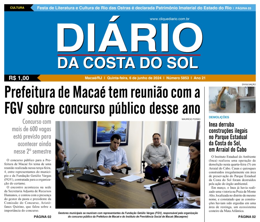 Edições Impressas Edição de quinta-feira 06/06/2024 nº 5853 Publicado em 06/06/2024 - 09:00 Escrito por Redação Notícias relacionadas: Seguinte Edição de sexta-feira 07/06/2024 nº 5854 Anterior Edição de quarta-feira 05/06/2024 nº 5852 Redação Notícias Recentes Cultura6 horas atrás Teatro de Rio das Ostras recebe 2 espetáculos de dança nesse fim de semana Arraial do cabo6 horas atrás FIPAC oferece serviços de saúde e prevenção ao câncer de próstata em Arraial do Cabo Arraial do cabo6 horas atrás Resultado preliminar do concurso de Arraial já está no ar pelo IBAM Edições Impressas6 horas atrás Edição de sábado a segunda-feira 15 a 17/11/2025 nº 6213 Cidades7 horas atrás Shopping Plaza Macaé inicia programação de Natal neste fim de semana Cabo Frio8 horas atrás Disputa em dobro marca encerramento em Cabo Frio do circuito de surf Cabo Frio23 horas atrás Agentes de Cabo Frio recebem novo treinamento técnico para atuar em casos de poluição sonora Cabo Frio24 horas atrás Homem procurado por latrocínio é detido por agentes em Cabo Frio Cabo Frio24 horas atrás Representante da Guarda Civil de Cabo Frio compete na etapa final ao lado de jovens atletas Polícia24 horas atrás Prefeito de Rio das Ostras volta de Brasília com esperança de novos investimentos Clique Diário E. L. Mídia Editora Ltda CNPJ: 09.298.880/0001-07 Redação: Rua Tupinambás 122 Gloria – Macaé/RJ comercial@diariocs.com (22) 2765-7353 (22) 999253130 Mais lidas da semana Cultura1 dia atrás Adilson Lopes apresenta exposição “Trajetória” em Casimiro de Abreu Cidades4 dias atrás Servidores de Rio das Ostras participam de treinamento do Estado em Búzios Polícia3 dias atrás Farmácia é interditada e uma pessoa é presa em Rio das Ostras em operação da Polícia Federal Mobilidade1 dia atrás Mobilidade promove fiscalização para verificar situação de táxis em Rio das Ostras