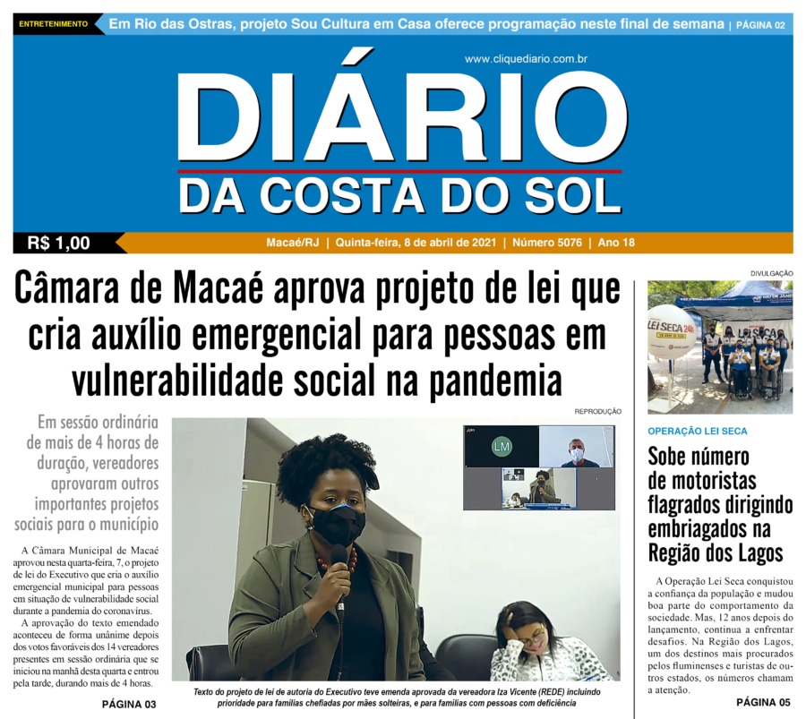 Edições Impressas Edição de quinta-feira 08/04/2021 nº 5076 Publicado em 08/04/2021 - 04:06 Escrito por Fernando Vitor Notícias relacionadas:destaque Seguinte Edição de sexta-feira 09/04/2021 nº 5077 Anterior Edição de quarta-feira 07/04/2021 nº 5075 Fernando Vitor Notícias Recentes Cidades58 minutos atrás Macaé discute armamento da Guarda Municipal como parte de ações para fortalecer a segurança pública Araruama1 hora atrás Presos em Araruama tinham mandados por roubo e associação criminosa Educação1 hora atrás Inscrição para vagas nas creches de Rio das Ostras em 2026 termina nessa sexta, 14 Cabo Frio1 hora atrás Cabo Frio executa nova etapa de sinalização horizontal na cidade Cidades1 hora atrás Agricultores e pecuaristas de Quissamã participam de encontro de capacitação e orientação técnica Arraial do cabo1 hora atrás Nova licença digital promete mais agilidade e transparência em Arraial do Cabo Polícia2 horas atrás Idoso é assassinado a tiros às margens da BR-101, em Campos Esporte2 horas atrás Atletas de Rio das Ostras e Saquarema conquistam título de brasileiro de bodyboarding Arraial do cabo2 horas atrás Sucesso de vendas faz pratos especiais continuarem até o fim de novembro em Arraial no Festival de Frutos do Mar Cabo Frio2 horas atrás Iniciativa reforça compromisso com a identidade cultural cabo-friense Clique Diário E. L. Mídia Editora Ltda CNPJ: 09.298.880/0001-07 Redação: Rua Tupinambás 122 Gloria – Macaé/RJ comercial@diariocs.com (22) 2765-7353 (22) 999253130 Mais lidas da semana Polícia1 dia atrás Farmácia é interditada e uma pessoa é presa em Rio das Ostras em operação da Polícia Federal Cidades2 dias atrás Servidores de Rio das Ostras participam de treinamento do Estado em Búzios Cidades1 dia atrás Vereadores de Macaé vão embarcar nesta quinta para participar da COP 30 em Belém Cidades1 dia atrás Parceria com o Estado reforça prevenção de enchentes em Rio das Ostras há 39 dias do verão