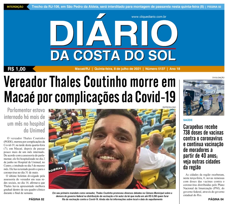 Edições Impressas Edição de quinta-feira 08/07/2021 nº 5137 Publicado em 08/07/2021 - 07:41 Escrito por Fernando Vitor Notícias relacionadas: Seguinte Edição de sexta-feira 09/07/2021 n° 5138 Anterior Edição de quarta-feira 07/07/2021 n° 5136 Fernando Vitor Notícias Recentes Polícia3 minutos atrás Polícia Civil de Macaé prende suspeito de tentativa de latrocínio ocorrido em 2023 Cidades17 minutos atrás Macaé intensifica campanha e anuncia Dia D para doação de sangue em 29 de novembro Lazer1 hora atrás Evento marca abertura do Natal em Silva Jardim nessa quarta-feira, 19 Polícia2 horas atrás Casal é preso com grande quantidade de drogas em ação da PM em Rio das Ostras Oportunidade3 horas atrás Banco de Empregos abre semana com 660 vagas para contração imediata em Rio das Ostras Cabo Frio22 horas atrás Cabo Frio antecipa a Black Friday com grandes marcas e atrações musicais Cidades1 dia atrás Procon de Rio das Ostras investiga denúncias de cobrança dupla na Enel Cidades1 dia atrás Macaé sediará o 8º Encontro Fluminense de Arborização Urbana em dezembro Cultura2 dias atrás Teatro de Rio das Ostras recebe 2 espetáculos de dança nesse fim de semana Arraial do cabo2 dias atrás FIPAC oferece serviços de saúde e prevenção ao câncer de próstata em Arraial do Cabo Clique Diário E. L. Mídia Editora Ltda CNPJ: 09.298.880/0001-07 Redação: Rua Tupinambás 122 Gloria – Macaé/RJ comercial@diariocs.com (22) 2765-7353 (22) 999253130 Mais lidas da semana Cultura3 dias atrás Adilson Lopes apresenta exposição “Trajetória” em Casimiro de Abreu Polícia5 dias atrás Farmácia é interditada e uma pessoa é presa em Rio das Ostras em operação da Polícia Federal Cidades6 dias atrás Servidores de Rio das Ostras participam de treinamento do Estado em Búzios Edições Impressas5 dias atrás Edição de quarta-feira 12/11/2025 nº 6210