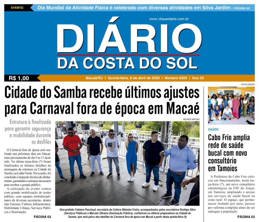 Edições Impressas Edição de quinta-feira 09/04/2026 nº 6305 Publicado em 09/04/2026 - 10:24 Escrito por Redação Notícias relacionadas: Anterior Edição de quarta-feira 08/04/2026 n° 6304 Redação Notícias Recentes Cabo Frio1 hora atrás Ação em Cabo Frio disponibiliza pets vacinados para adoção neste sábado Cidades1 hora atrás Procon de Rio das Ostras alerta para cuidados com golpes e fraudes virtuais Cidades1 hora atrás Guarda Municipal age rápido e evita dano ao patrimônio público em Macaé Cidades2 horas atrás Quissamã investe na qualificação de profissionais da saúde municipal Cidades2 horas atrás Aniversário de Rio das Ostras tem alteração no funcionamento de unidades públicas Polícia2 horas atrás Polícia encontra drogas e munições em casa usada pelo tráfico no Parque Aeroporto Cabo Frio3 horas atrás Prefeitura de Cabo Frio conclui formação e amplia preparo da Guarda Civil Municipal Arraial do cabo3 horas atrás Cadastramento presencial busca organizar atividade pesqueira em Arraial do Cabo Arraial do cabo3 horas atrás Operação na Praia do Pontal, em Arraial do Cabo, resulta em apreensão e reforça regras de uso dos espaços públicos Arraial do cabo3 horas atrás Corrida entre praias de Arraial do Cabo e Cabo Frio destaca turismo e qualidade de vida Clique Diário E. L. Mídia Editora Ltda CNPJ: 09.298.880/0001-07 Redação: Rua Tupinambás 122 Gloria – Macaé/RJ comercial@diariocs.com (22) 2765-7353 (22) 999253130 Mais lidas da semana Polícia2 dias atrás Homem condenado por estupro é preso em Rio das Ostras em ação das polícias Militar e Federal Edições Impressas6 dias atrás Edição de sexta a segunda-feira 03 a 06/04/2026 nº 6302 Cabo Frio1 dia atrás Município de Cabo Frio participa de articulação sobre futuro financeiro ligado ao petróleo Cidades3 dias atrás Prefeitura de Macaé inicia regularização fundiária em Lagomar e Malvinas