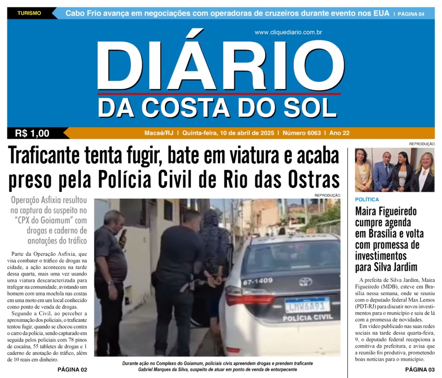 Edições Impressas Edição de quinta-feira 10/04/2025 nº 6063 Publicado em 10/04/2025 - 07:42 Escrito por Redação Notícias relacionadas: Seguinte Edição de sexta-feira 11/04/2025 nº 6064 Anterior Edição de quarta-feira 09/04/2025 nº 6062 Redação Notícias Recentes Mobilidade44 minutos atrás Acidente assusta moradores e deixa RJ-106 interditada em Saquarema Iguaba1 hora atrás Carro despenca em valão e mobiliza equipes de resgate em Iguaba Grande Cabo Frio1 hora atrás Audiência pública discute receitas e despesas previstas para Cabo Frio no próximo ano Cabo Frio1 hora atrás Contribuintes de Cabo Frio podem quitar dívidas ajudando causas sociais Cabo Frio2 horas atrás Evento religioso e cultural reúne fiéis na Semana Evangélica de Cabo Frio Cidades4 horas atrás Sana celebra 123 anos com programação cultural especial Cidades4 horas atrás Silas Andrade brilha e coloca Macaé no pódio da Copa Latino-Americana de BMX Polícia5 horas atrás Furto de celular leva a prisão de um casal em Macaé Cidades5 horas atrás Silva Jardim segue o Estado e transfere ponto facultativo para sexta, 31 Cultura5 horas atrás Prêmio Literário reúne rede pública municipal no Teatro de Rio das Ostras nessa quarta, 29 Clique Diário E. L. Mídia Editora Ltda CNPJ: 09.298.880/0001-07 Redação: Rua Tupinambás 122 Gloria – Macaé/RJ comercial@diariocs.com (22) 2765-7353 (22) 999253130 Mais lidas da semana Edições Impressas3 dias atrás Edição de sábado a segunda-feira 25 a 27/10/2025 nº 6198 Edições Impressas6 dias atrás Edição de quarta-feira 22/10/2025 nº 6195 Edições Impressas5 dias atrás Edição de quinta-feira 23/10/2025 nº 6196 Cidadania4 dias atrás Plano Diretor de Rio das Ostras é tema de fórum da sociedade civil nesse sábado, 25
