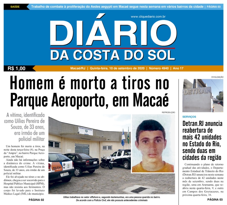 Edições Impressas Edição de quinta-feira 10/09/2020 nº 4940 Publicado em 10/09/2020 - 05:00 Escrito por Fernando Vitor Notícias relacionadas:destaque Seguinte Edição de sexta-feira 11/09/2020 nº 4941 Anterior Edição de quarta-feira 09/09/2020 nº 4939 Fernando Vitor Notícias Recentes Cabo Frio7 horas atrás Arte e solidariedade marcam a 1ª Mostra de Dança Regional de Tamoios Cidades12 horas atrás Região serrana de Macaé recebe 1º X-Force Passeio de Quadriciclo e Aranha neste domingo (26) Polícia12 horas atrás Polícia apreende mais de meio quilo de drogas no Loteamento São João, em Rio das Ostras Saúde1 dia atrás Eventos esportivo e cultural reforça campanha do Outubro Rosa em Rio das Ostras nesse domingo, 26 Edições Impressas1 dia atrás Sábado a segunda-feira 25 a 27/10/2025 nº 6197 Cidades2 dias atrás Shopping Plaza Macaé oferece programação gratuita com feira de adoção e show de pagode neste fim de semana Cidades2 dias atrás 32º BPM completa 23 anos com solenidade de celebração e reconhecimento aos policiais Armação dos Búzios2 dias atrás Búzios celebra esporte e superação com XC RUN 2025 Araruama2 dias atrás Araruama promove saúde, lazer e cidadania em evento comunitário Arraial do cabo2 dias atrás Educação e sustentabilidade se encontram para jovens de Arraial do Cabo Clique Diário E. L. Mídia Editora Ltda CNPJ: 09.298.880/0001-07 Redação: Rua Tupinambás 122 Gloria – Macaé/RJ comercial@diariocs.com (22) 2765-7353 (22) 999253130 Mais lidas da semana Cultura6 dias atrás Silva Jardim anuncia shows gratuitos de samba e pagode para o fim de semana Cultura5 dias atrás Música, emoção e cores: Rodrigo Pontes apresenta show especial em Rio das Ostras Cabo Frio6 dias atrás Atletas de várias cidades se enfrentam em competição de Muay Thai em Cabo Frio Cabo Frio6 dias atrás Serviços essenciais permanecem ativos durante ponto facultativo em Cabo Frio