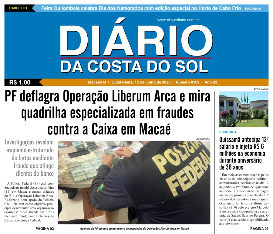 Edições Impressas Edição de quinta-feira 12/06/2025 nº 6103 Publicado em 12/06/2025 - 09:33 Escrito por Redação Notícias relacionadas: Seguinte Edição de sexta-feira 13/06/2025 nº 6104 Anterior Edição de quarta-feira 11/06/2025 nº 6102 Redação Notícias Recentes Cabo Frio15 horas atrás Reforma marca nova fase para o esporte cabo-friense e aniversário da cidade Arraial do cabo15 horas atrás Fórum de Arraial propõe novo modelo de desenvolvimento baseado nos 3Ds; Desvincular, Descarbonizar e Descontaminar Saúde15 horas atrás Saúde de Rio das Ostras promove mutirão de cirurgia pediátrica nessa semana Cidades15 horas atrás Guarda Ambiental resgata jiboia de três metros em área urbana de Macaé Cidades16 horas atrás Vereadores de Macaé vão embarcar nesta quinta para participar da COP 30 em Belém Arraial do cabo16 horas atrás Parceria com a PF fortalece preparo técnico da Segurança Pública de Arraial do Cabo Arraial do cabo16 horas atrás Iniciativa busca compensar emissões de carbono da frota de Arraial Cidades17 horas atrás Parceria com o Estado reforça prevenção de enchentes em Rio das Ostras há 39 dias do verão Desenvolvimento17 horas atrás Arteris vence novo leilão da BR-101 e mantém operação da via até 2047 Cidades17 horas atrás Prefeitura de Quissamã abre prazo para solicitação de isenção do IPTU 2026 e 2027 Clique Diário E. L. Mídia Editora Ltda CNPJ: 09.298.880/0001-07 Redação: Rua Tupinambás 122 Gloria – Macaé/RJ comercial@diariocs.com (22) 2765-7353 (22) 999253130 Mais lidas da semana Arraial do cabo7 dias atrás Arraial do Cabo celebra 3ª edição do Festival de Frutos do Mar com entrada livre; Carol Biazin, Ramona Rox, Liah Soares e mais Meio Ambiente7 dias atrás Ações do Programa Limpa Rio seguem em vários pontos de Rio das Ostras Cabo Frio7 dias atrás Música, poesia e memória celebram os 410 anos de Cabo Frio Polícia22 horas atrás Farmácia é interditada e uma pessoa é presa em Rio das Ostras em operação da Polícia Federal