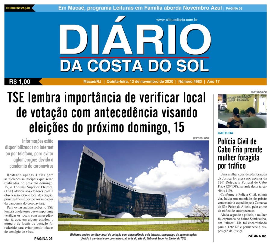 Edições Impressas Edição de quinta-feira 12/11/2020 nº 4983 Publicado em 12/11/2020 - 03:46 Escrito por Fernando Vitor Notícias relacionadas:destaque Seguinte Edição de sexta-feira 13_11_2020 nº 4984 Anterior Edição de quarta-feira 11/11/2020 nº 4982 Fernando Vitor Notícias Recentes São Pedro da Aldeia10 horas atrás Feirão de Empregabilidade promete movimentar a Praça das Águas em São Pedro da Aldeia Diversão10 horas atrás Praia do Abricó, em Rio das Ostras, sedia evento fitness nesse fim de semana Arraial do cabo11 horas atrás Feira de Ciências e Tecnologia em Arraial tem visita ilustre dos cães da Segurança Pública Arraial do cabo11 horas atrás Arraial do Cabo tem renovação da certificação Internacional de turismo sustentável na Lagoa do Caiçara Cabo Frio11 horas atrás Cercamento e plantio de espécies nativas marcam nova fase de recuperação ambiental em Cabo Frio Cidades11 horas atrás Homem é preso com grande quantidade de drogas no Lagomar, em Macaé Cidades11 horas atrás Alerj aprova projeto que garante salário integral a familiares de PMs mortos em combate Cidades11 horas atrás GCM de Campos participa de curso de operador da Patrulha Maria da Penha em Niterói Meio Ambiente11 horas atrás Ações do Programa Limpa Rio seguem em vários pontos de Rio das Ostras Cidades12 horas atrás Quissamã participa do lançamento do Programa Ambiente Resiliente, do Governo do Estado Clique Diário E. L. Mídia Editora Ltda CNPJ: 09.298.880/0001-07 Redação: Rua Tupinambás 122 Gloria – Macaé/RJ comercial@diariocs.com (22) 2765-7353 (22) 999253130 Mais lidas da semana Mobilidade7 dias atrás Rio das Ostras intensifica ações de combate a irregularidades no trânsito Cidades2 dias atrás HFM ganha novo Pronto-Socorro moderno e ampliado em Campos Educação7 dias atrás Cerimônia no Teatro fecha o 2º Prêmio Literário do Ensino Fundamental de Rio das Ostras Cultura6 dias atrás Nova temporada do Rio das Ostras Instrumental apresenta show de Nico Rezende