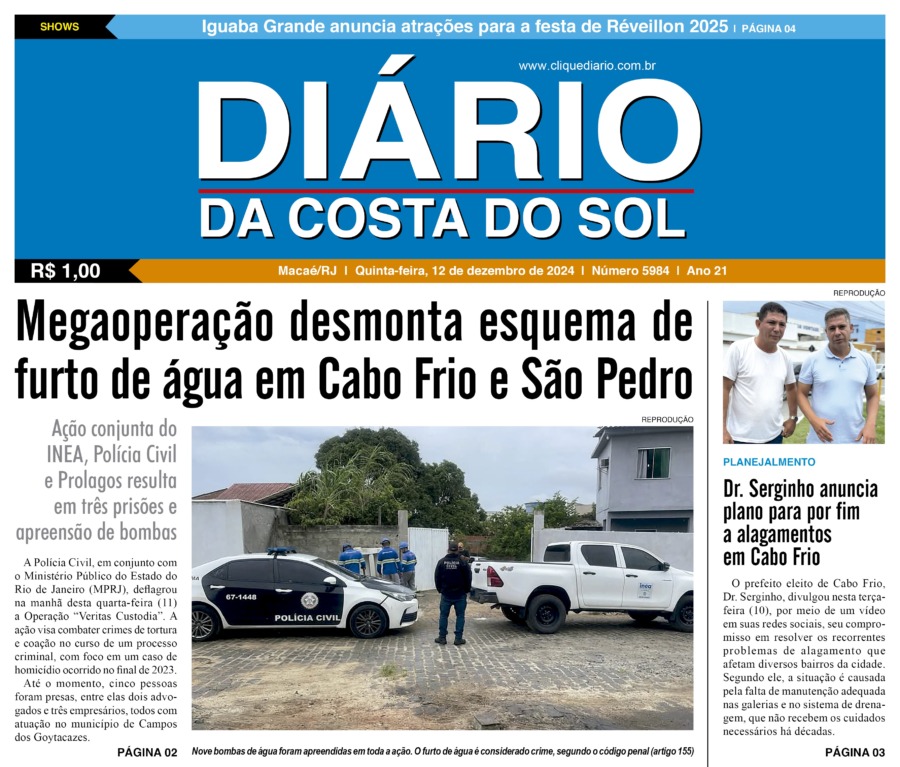 Edições Impressas Edição de quinta-feira 12/12/2024 nº 5984 Publicado em 12/12/2024 - 08:06 Escrito por Redação Notícias relacionadas: Seguinte Edição de sexta-feira 13/12/2024 n° 5985 Anterior Edição de quarta-feira 11/12/2024 nº 5983 Redação Notícias Recentes Cabo Frio4 horas atrás Agentes de Cabo Frio recebem novo treinamento técnico para atuar em casos de poluição sonora Cabo Frio5 horas atrás Homem procurado por latrocínio é detido por agentes em Cabo Frio Cabo Frio5 horas atrás Representante da Guarda Civil de Cabo Frio compete na etapa final ao lado de jovens atletas Polícia5 horas atrás Prefeito de Rio das Ostras volta de Brasília com esperança de novos investimentos Cidades5 horas atrás Campos publica 8ª convocação e chama 374 professores substitutos para a rede municipal Esporte5 horas atrás De Saquarema para o Brasileirão: Vasco troca gramado de São Januário Cidades5 horas atrás Quissamã inicia planejamento educacional para 2026 com foco em Educação Financeira Polícia8 horas atrás Mulher é presa na RJ-106, em Saquarema, com R$ 38 mil em drogas e arma Saúde9 horas atrás Silva Jardim tem aulão em alusão à campanha mundial do Novembro Azul Mobilidade10 horas atrás Mobilidade promove fiscalização para verificar situação de táxis em Rio das Ostras Clique Diário E. L. Mídia Editora Ltda CNPJ: 09.298.880/0001-07 Redação: Rua Tupinambás 122 Gloria – Macaé/RJ comercial@diariocs.com (22) 2765-7353 (22) 999253130 Mais lidas da semana Cultura10 horas atrás Adilson Lopes apresenta exposição “Trajetória” em Casimiro de Abreu Cidades3 dias atrás Servidores de Rio das Ostras participam de treinamento do Estado em Búzios Polícia2 dias atrás Farmácia é interditada e uma pessoa é presa em Rio das Ostras em operação da Polícia Federal Cidades2 dias atrás Vereadores de Macaé vão embarcar nesta quinta para participar da COP 30 em Belém