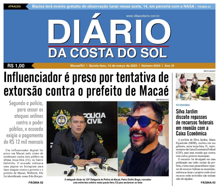 Edições Impressas Edição de quinta-feira 13/03/2025 nº 6043 Publicado em 13/03/2025 - 08:31 Escrito por Redação Notícias relacionadas: Seguinte Edição de sexta-feira 14/03/2025 nº 6044 Anterior Edição de quarta-feira 12/03/2025 nº 6042 Redação Notícias Recentes Edições Impressas54 minutos atrás Edição de sexta-feira 31/10/2025 nº 6202 Saúde17 horas atrás Rio das Ostras ultrapassa marca dos 13,5 mil pets vacinados em campanha contra a raiva Cidades17 horas atrás Procon apreende bebidas em depósito no bairro São José do Barreto, em Macaé Araruama17 horas atrás Prefeitura de Araruama apresenta detalhes da Expo 2025 e reforça operação de segurança e trânsito Arraial do cabo17 horas atrás Secretaria de Mobilidade Urbana de Arraial participa de congresso nacional em São Paulo Polícia17 horas atrás Polícia Militar recupera Fiat Toro abndonado às margens da Linha Azul, em Macaé Arraial do cabo17 horas atrás Conselho Municipal de Arraial promove encontro sobre políticas de proteção animal Cabo Frio17 horas atrás Cabo Frio amplia medidas de preservação com novas placas e plantio de espécies nativas Cidades17 horas atrás Carapebus conclui curso técnico para agentes de saúde e de endemias Comércio18 horas atrás Plaza Rio das Ostras ganha 7 novas lojas em outubro e já prepara mais uma inauguração Clique Diário E. L. Mídia Editora Ltda CNPJ: 09.298.880/0001-07 Redação: Rua Tupinambás 122 Gloria – Macaé/RJ comercial@diariocs.com (22) 2765-7353 (22) 999253130 Mais lidas da semana Edições Impressas6 dias atrás Edição de sábado a segunda-feira 25 a 27/10/2025 nº 6198 Cultura2 dias atrás Prédio da Onda, em Rio das Ostras, recebe oficina teatral gratuita a partir dessa quinta, 30 Cultura7 dias atrás Teatro de Rio das Ostras tem fim de semana com 2 espetáculos locais Edições Impressas7 dias atrás Edição de sexta-feira 24/10/2025 nº 6197