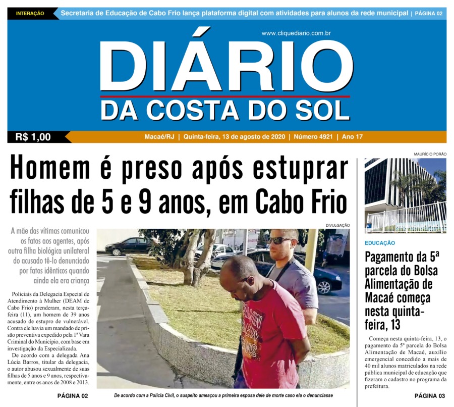 Edições Impressas Edição de quinta-feira 13/08/2020 nº 4921 Publicado em 13/08/2020 - 05:00 Escrito por Fernando Vitor Notícias relacionadas:destaque Seguinte Edição de sexta-feira 14/08/2020 nº 4922 Anterior Edição de quarta-feira 12/08/2020 nº 4920 Fernando Vitor Notícias Recentes Cabo Frio12 horas atrás Arte e solidariedade marcam a 1ª Mostra de Dança Regional de Tamoios Cidades18 horas atrás Região serrana de Macaé recebe 1º X-Force Passeio de Quadriciclo e Aranha neste domingo (26) Polícia18 horas atrás Polícia apreende mais de meio quilo de drogas no Loteamento São João, em Rio das Ostras Saúde2 dias atrás Eventos esportivo e cultural reforça campanha do Outubro Rosa em Rio das Ostras nesse domingo, 26 Edições Impressas2 dias atrás Sábado a segunda-feira 25 a 27/10/2025 nº 6197 Cidades2 dias atrás Shopping Plaza Macaé oferece programação gratuita com feira de adoção e show de pagode neste fim de semana Cidades2 dias atrás 32º BPM completa 23 anos com solenidade de celebração e reconhecimento aos policiais Armação dos Búzios2 dias atrás Búzios celebra esporte e superação com XC RUN 2025 Araruama2 dias atrás Araruama promove saúde, lazer e cidadania em evento comunitário Arraial do cabo2 dias atrás Educação e sustentabilidade se encontram para jovens de Arraial do Cabo Clique Diário E. L. Mídia Editora Ltda CNPJ: 09.298.880/0001-07 Redação: Rua Tupinambás 122 Gloria – Macaé/RJ comercial@diariocs.com (22) 2765-7353 (22) 999253130 Mais lidas da semana Cultura6 dias atrás Silva Jardim anuncia shows gratuitos de samba e pagode para o fim de semana Cultura6 dias atrás Música, emoção e cores: Rodrigo Pontes apresenta show especial em Rio das Ostras Cabo Frio6 dias atrás Atletas de várias cidades se enfrentam em competição de Muay Thai em Cabo Frio Cabo Frio6 dias atrás Serviços essenciais permanecem ativos durante ponto facultativo em Cabo Frio
