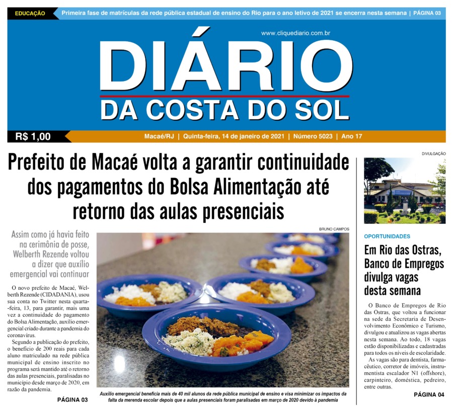 Edições Impressas Edição de quinta-feira 14/01/2021 nº 5023 Publicado em 14/01/2021 - 01:02 Escrito por Fernando Vitor Notícias relacionadas:destaque Seguinte Edição de sexta-feira 15/01/2021 nº 5024 Anterior Edição de quarta-feira 13/01/2021 nº 5022 Fernando Vitor Notícias Recentes Cabo Frio7 horas atrás Polícia investiga ataque armado ocorrido em via rural de Cabo Frio Arraial do cabo7 horas atrás Gastronomia, música e chopp artesanal agitam a Praia Grande em Arraial do Cabo Cabo Frio7 horas atrás Convento Nossa Senhora dos Anjos em Cabo Frio recebe última edição do ‘Nosso Samba’ em 2025 Cabo Frio7 horas atrás Maracatu do Tambor de Cumba movimenta Cabo Frio no Novembro Negro em Museu Charitas Cabo Frio7 horas atrás Mobilização nacional une Cabo Frio no enfrentamento à dengue Cabo Frio8 horas atrás Educação ambiental de Cabo Frio ganha destaque com placas informativas na orla Educação8 horas atrás Rio das Ostras abre inscrições para vagas em creches municipais para 2026 Cidades8 horas atrás Quissamã abre pré-matrículas para o ano letivo de 2026 nesta terça-feira (11) Cidades9 horas atrás Procon Macaé emite alerta para consumidores durante a Black Friday Polícia9 horas atrás Homem é preso em Campos acusado de abusar de criança de 5 anos Clique Diário E. L. Mídia Editora Ltda CNPJ: 09.298.880/0001-07 Redação: Rua Tupinambás 122 Gloria – Macaé/RJ comercial@diariocs.com (22) 2765-7353 (22) 999253130 Mais lidas da semana Arraial do cabo5 dias atrás Arraial do Cabo celebra 3ª edição do Festival de Frutos do Mar com entrada livre; Carol Biazin, Ramona Rox, Liah Soares e mais Cidades6 dias atrás HFM ganha novo Pronto-Socorro moderno e ampliado em Campos Meio Ambiente4 dias atrás Ações do Programa Limpa Rio seguem em vários pontos de Rio das Ostras Meio Ambiente5 dias atrás Programa do governo estadual promove limpeza de rio no Âncora, em Rio das Ostras