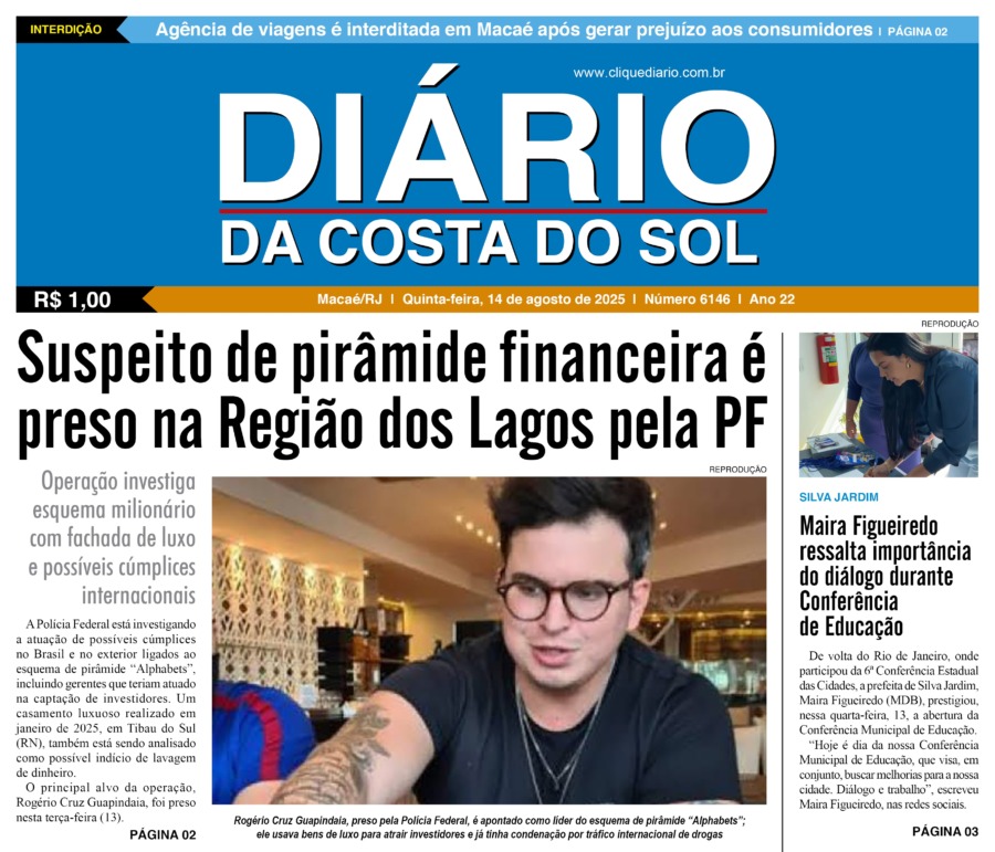 Edições Impressas Edição de quinta-feira 14/08/2025 nº 6146 Publicado em 14/08/2025 - 09:26 Escrito por Redação Notícias relacionadas: Seguinte Edição de sexta-feira 15/08/2025 nº 6147 Anterior Edição de quarta-feira 13/08/2025 nº 6145 Redação Notícias Recentes Polícia19 minutos atrás Adolescente é detida em Maricá em ação que apreendeu grande quantidade de drogas Polícia36 minutos atrás Polícia apreende drogas em caixa de energia de casa em Rio das Ostras Comércio1 hora atrás Plaza Rio das Ostras anuncia chegada do Papai Noel e programação de Natal Polícia2 horas atrás Ação do GAT do 32º BPM termina com apreensão de drogas e prisão de suspeito na Aroeira, em Macaé Polícia2 horas atrás Moto roubada é recuperada em Macaé durante ação conjunta entre PM e Mobilidade Urbana Polícia2 horas atrás Polícia Militar apreende fuzil e drogas em operação na comunidade das Malvinas, em Macaé Cidades21 horas atrás Macaé lança o Jornal do Servidor no dia 12 de novembro durante congresso na Câmara Municipal Cidades1 dia atrás Prefeito de Rio das Ostras participa de evento sobre cidades inteligentes em Barcelona, na Espanha Cabo Frio2 dias atrás Estudantes de Cabo Frio brilham em premiação do projeto CaptaAção Meio Ambiente2 dias atrás Cepro promove encontro para discutir avanços e desafios da justiça climática em Rio das Ostras Clique Diário E. L. Mídia Editora Ltda CNPJ: 09.298.880/0001-07 Redação: Rua Tupinambás 122 Gloria – Macaé/RJ comercial@diariocs.com (22) 2765-7353 (22) 999253130 Mais lidas da semana Arraial do cabo4 dias atrás Arraial do Cabo celebra 3ª edição do Festival de Frutos do Mar com entrada livre; Carol Biazin, Ramona Rox, Liah Soares e mais Educação6 dias atrás Estudantes de Rio das Ostras são destaques em evento nacional da Educação Meio Ambiente4 dias atrás Ações do Programa Limpa Rio seguem em vários pontos de Rio das Ostras Polícia7 dias atrás Homem é preso em Maricá depois de matar uma pessoa a facadas nessa madrugada