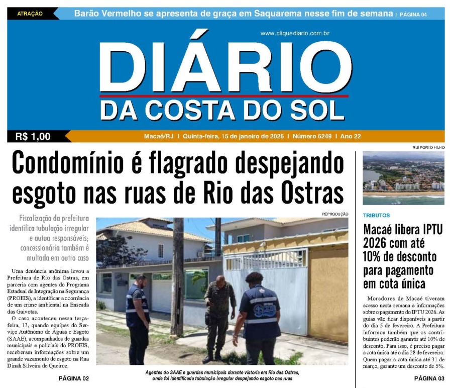 Edições Impressas Edição de quinta-feira 15/01/2026 nº 6249 Publicado em 15/01/2026 - 09:14 Escrito por Redação Notícias relacionadas: Anterior Edição de quarta-feira 14/01/2026 nº 6248 Redação Notícias Recentes Cidades18 minutos atrás Macaé se prepara para o Esporte Verão 2026 com vôlei de praia na Praia Campista Polícia36 minutos atrás Polícia apreende drogas depois de trocar tiros com traficantes em Rio das Ostras Edições Impressas1 hora atrás Edição de quinta-feira 15/01/2026 nº 6249 Cabo Frio17 horas atrás Moradores acionam polícia após agressão contra mulher em Cabo Frio Cabo Frio17 horas atrás Centro de Cabo Frio recebe evento de adoção animal neste sábado Cabo Frio17 horas atrás Processo seletivo da educação em Cabo Frio tem resultado preliminar Cabo Frio18 horas atrás Cabo Frio aposta em grandes eventos para fortalecer a alta temporada Arraial do cabo18 horas atrás Área conhecida como Janela do Paraíso será interditada em Arraial do Cabo Cabo Frio18 horas atrás Palácio das Águias abre mostra coletiva que celebra identidade cultural de Cabo Frio Meio Ambiente18 horas atrás Denúncia de vazamento de esgoto leva prefeitura a flagrar crime ambiental em Rio das Ostras Clique Diário E. L. Mídia Editora Ltda CNPJ: 09.298.880/0001-07 Redação: Rua Tupinambás 122 Gloria – Macaé/RJ comercial@diariocs.com (22) 2765-7353 (22) 999253130 Mais lidas da semana Cabo Frio2 dias atrás Cabo Frio fortalece política cultural com cadastro reaberto e exibição de produção audiovisual original Cidades3 dias atrás Veículo roubado em Niterói é localizado e recuperado pela PM em Macaé Edições Impressas6 dias atrás Edição de sexta-feira 09/01/2026 nº 6245 Cidades2 dias atrás Prefeitura de Carapebus avança na implantação do Plano Municipal de Resíduos Sólidos