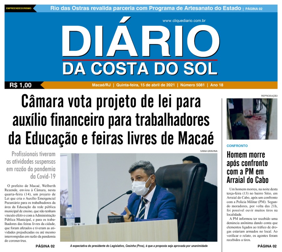 Edições Impressas Edição de quinta-feira 15/04/2021 nº 5081 Publicado em 15/04/2021 - 00:00 Escrito por Fernando Vitor Notícias relacionadas:destaque Seguinte Edição de sexta-feira 16/04/2021 nº 5082 Anterior Edição de quarta-feira 14/04/2021 nº 5080 Fernando Vitor Notícias Recentes Cidades5 horas atrás Macaé discute armamento da Guarda Municipal como parte de ações para fortalecer a segurança pública Araruama6 horas atrás Presos em Araruama tinham mandados por roubo e associação criminosa Educação6 horas atrás Inscrição para vagas nas creches de Rio das Ostras em 2026 termina nessa sexta, 14 Cabo Frio6 horas atrás Cabo Frio executa nova etapa de sinalização horizontal na cidade Cidades6 horas atrás Agricultores e pecuaristas de Quissamã participam de encontro de capacitação e orientação técnica Arraial do cabo6 horas atrás Nova licença digital promete mais agilidade e transparência em Arraial do Cabo Polícia6 horas atrás Idoso é assassinado a tiros às margens da BR-101, em Campos Esporte6 horas atrás Atletas de Rio das Ostras e Saquarema conquistam título de brasileiro de bodyboarding Arraial do cabo6 horas atrás Sucesso de vendas faz pratos especiais continuarem até o fim de novembro em Arraial no Festival de Frutos do Mar Cabo Frio6 horas atrás Iniciativa reforça compromisso com a identidade cultural cabo-friense Clique Diário E. L. Mídia Editora Ltda CNPJ: 09.298.880/0001-07 Redação: Rua Tupinambás 122 Gloria – Macaé/RJ comercial@diariocs.com (22) 2765-7353 (22) 999253130 Mais lidas da semana Cidades2 dias atrás Servidores de Rio das Ostras participam de treinamento do Estado em Búzios Polícia2 dias atrás Farmácia é interditada e uma pessoa é presa em Rio das Ostras em operação da Polícia Federal Polícia6 dias atrás Polícia prende 3 homens envolvidos com o tráfico em Rio das Ostras Cidades1 dia atrás Vereadores de Macaé vão embarcar nesta quinta para participar da COP 30 em Belém